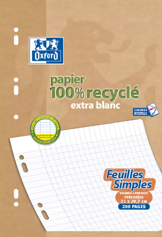 Accueil > Fournitures scolaires écologiques > Cahiers, blocs et copies en papier recyclé > Copies simples recyclées Oxford grands carreaux perforées A4 90g