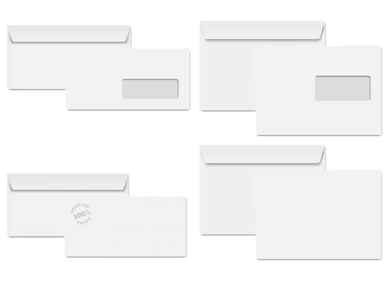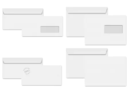 Enveloppes en papier 80 g/m², 100% recyclé certifié «Ange Bleu» et FSC®, avec un haut degré de blancheur (CIE 145). Le fond des enveloppes est imprimé en gris et la fenêtre en papier cristal 35 g/m² est 100% biodégradable. Elles sont munies d'une fermeture auto-adhésive avec bande de protection.
