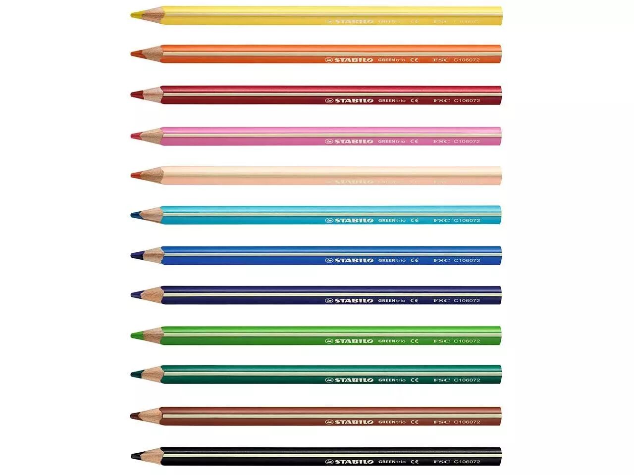 Crayons multicolores épais aux couleurs intenses et à la forme triangulaire ergonomique, parfaits pour les mains d’enfants et pour tous ceux qui aiment colorier. En bois certifié FSC®, vernis mat. Douze couleurs.