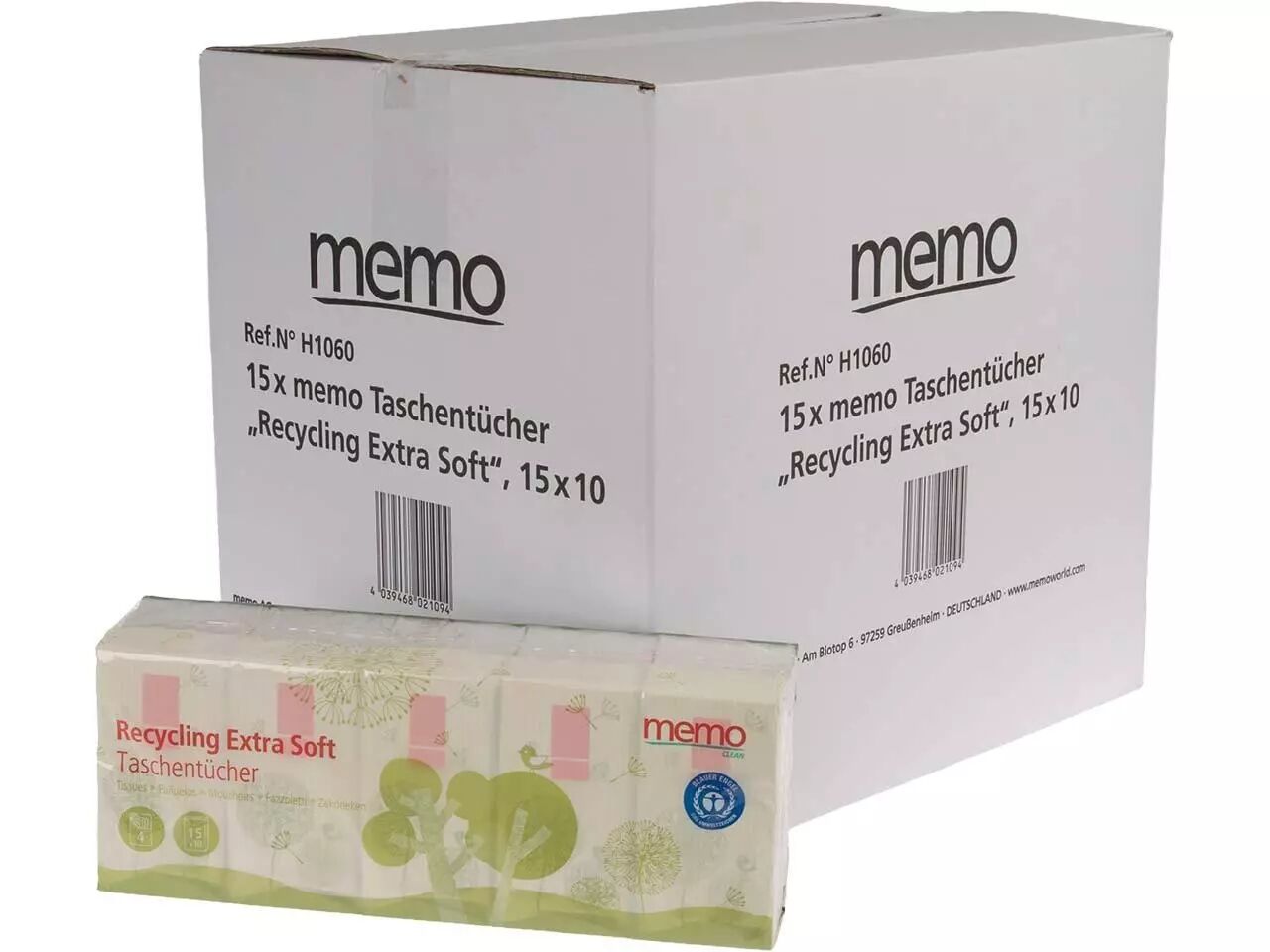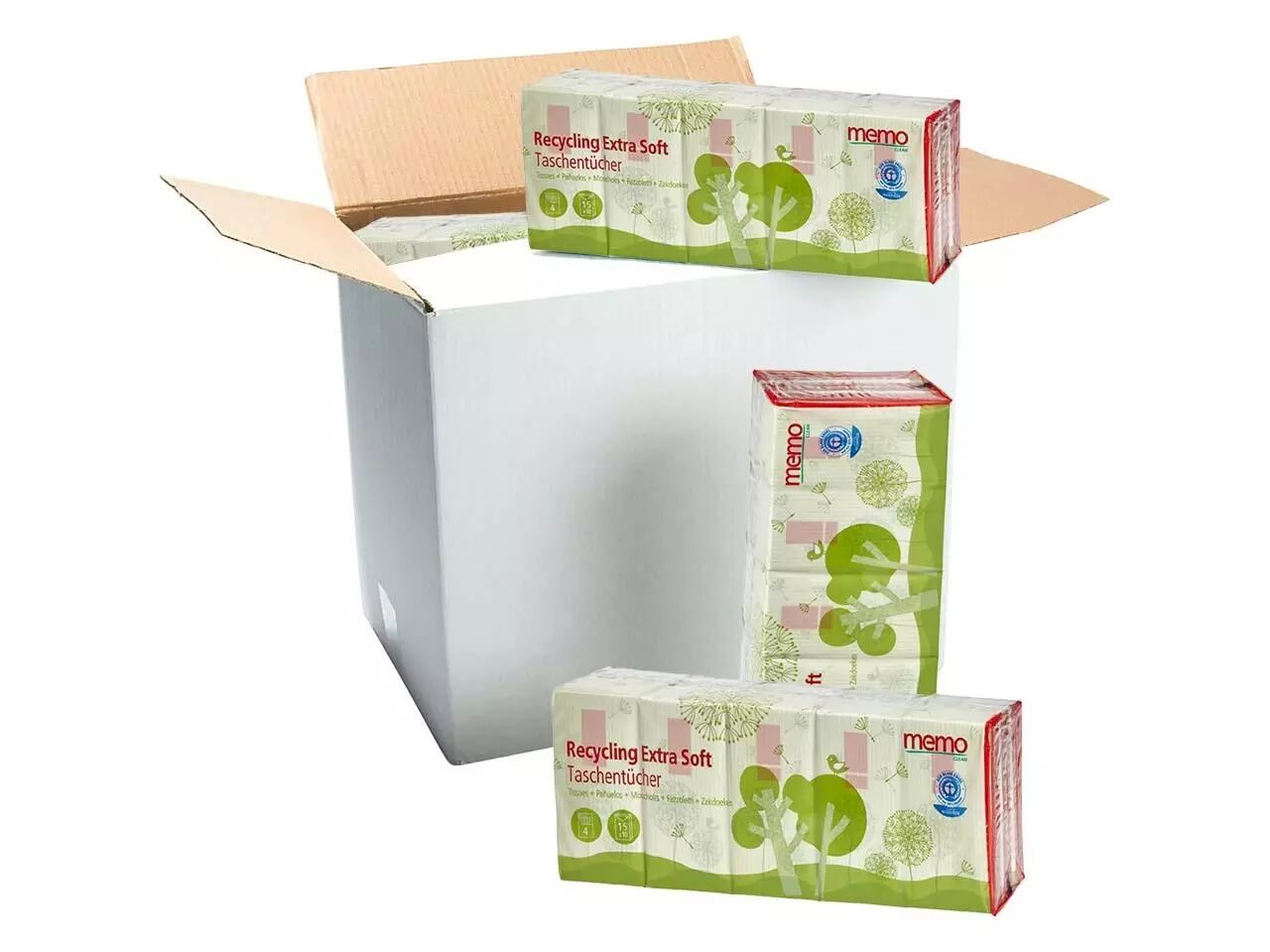 Les mouchoirs recyclés Memo « Extra Soft » sont très doux : on a peine à croire qu'ils sont issus à 100% de fibres recyclées ! Leur douceur et leur solidité proviennent d'une confection en quatre couches et d'une bordure renforcée. Étui en polyéthylène pratique de 10 mouchoirs avec fermeture.