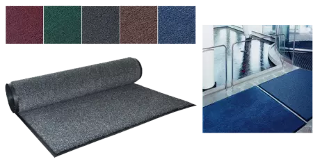 Grand tapis anti-salissure ou paillasson à usage professionnel, pour les entrées de bureaux et magasins. Partie absorbante 100 % fibres oléfine (velours de 510 g/m², fait de polypropylène recyclabe), sur une base vinyle antidérapante. Les fibres d'oléfine combinent un poids léger avec une haute résistance mécanique et à l'abrasion. Elles présentent également une forte capacité d'absorption de la saleté et de l'humidité (jusqu'à 7 litres d'eau par m²). Inodores, ces tapis sèchent rapidement, et se nettoyent facilement à l'aspirateur ou en les secouant. Il présentent une bonne résistance à la décoloration. Épaisseur 9 mm. Également disponible en rouleaux sur devis.