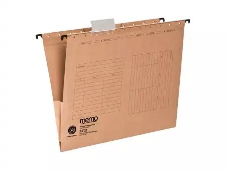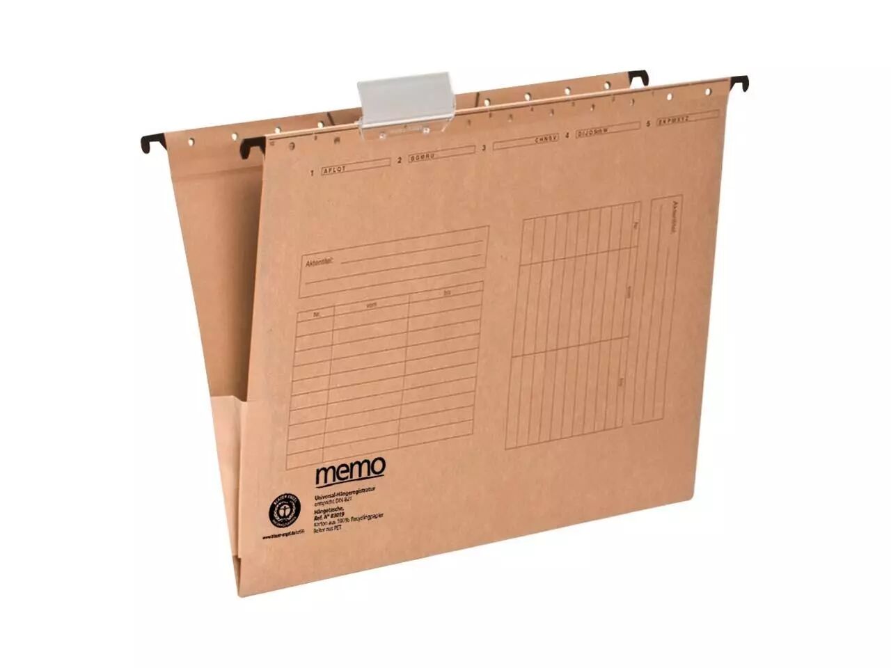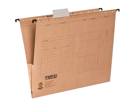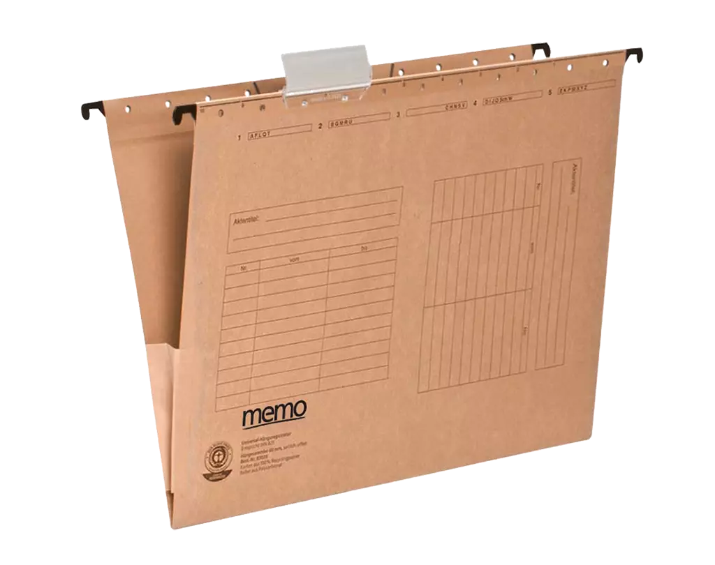 Format A4 avec onglets personnalisables. Dossiers suspendus de qualité au meilleur prix. 100% carton recyclé haute résistance 230 g/m². Stockage universel, système de montage par rivetage métal, tringle de suspension métallique, entraxe 330 mm, norme DIN 821. Onglet sous forme de porte-étiquette en polycarbonate écologique au lieu de PVC. Label « Ange Bleu ».