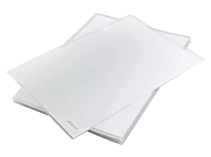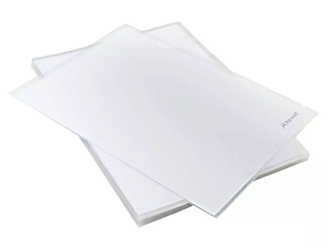 Pochette coin en polypropylen (PP) 100 % recyclé. Format A4, avec encoche et surface légèrement grainée. Epaisseur 160 microns. Paquet de 25 pochettes.