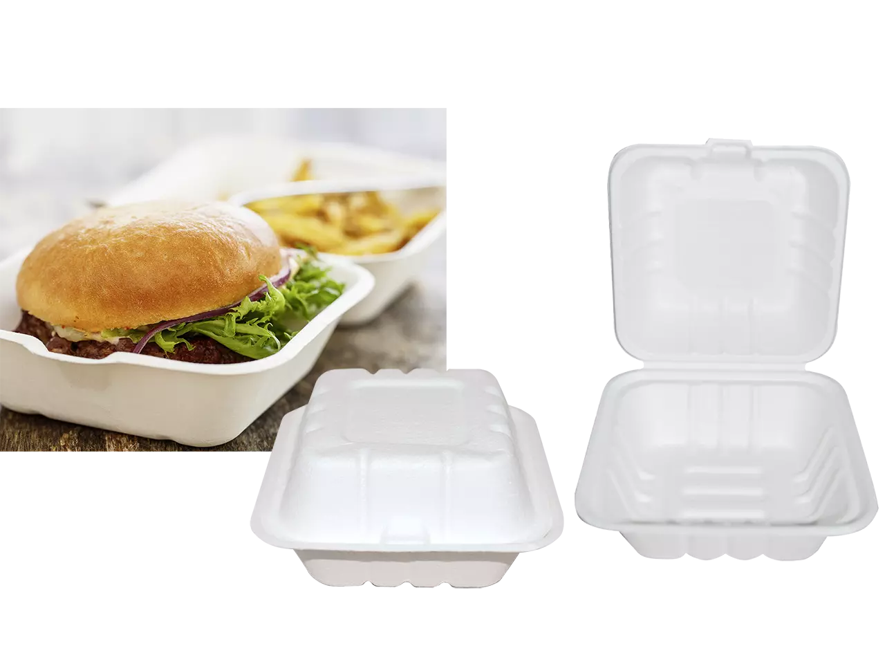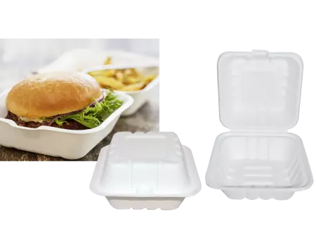 Cette boîte à hamburger est composée à 100% de fibres de canne à sucre. Doublement écologique car elle transforme ce qui était un déchet de la production sucrière en une matière première renouvelable, biodégradable et apte au compostage industriel. Elle convient bien sûr au contact alimentaire et résiste aux matières grasses et à des températures de 90 ° C, elle peut passer au micro-ondes.