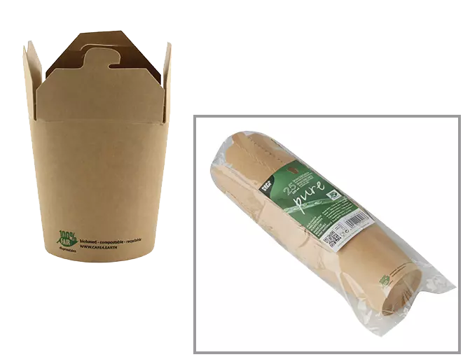 Innovante et durable, cette gamme d'emballages est fabriquée en carton fibres vierges, non blanchi certifié FSC®. Ils sont enduits d'une couche de bioplastique d'origine naturelle pour résister aux matières grasses et au chaud (PLA, issu de la transformation de l'amidon de maïs). Ils sont entièrement biodégradables, compostables et recyclables. Seuls des matériaux renouvelables rentrent dans leur composition.