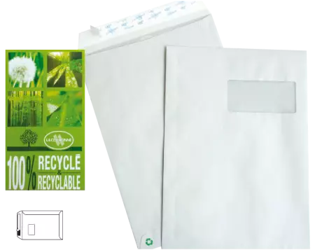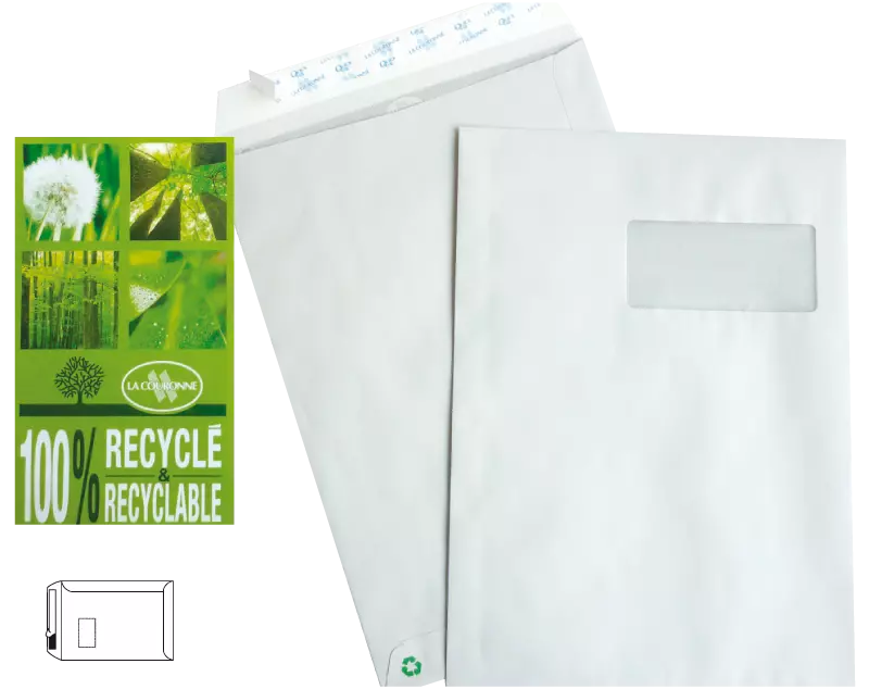 Ces pochettes recyclées, au format C4 (229 x 324 mm), avec une fenêtre 50 x 110 mm, possèdent une ferneture auto-adhésives avec bande protectrice. Réalisées en France à partir de papier recyclé blanc résistant 90g, elles sont 100% recyclées et recyclables.