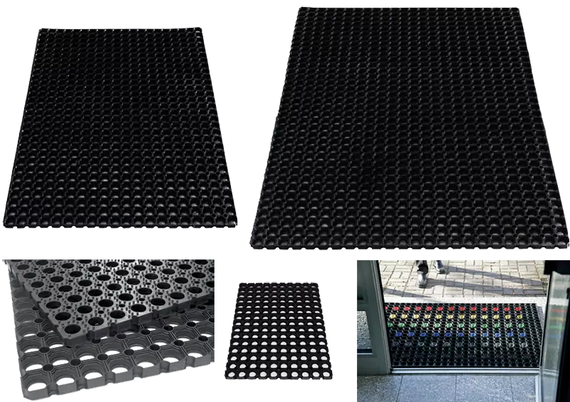Paillasson en caoutchouc, idéal pour l'extérieur des magasins, entrepôts, hôtels, restaurants, cantines, etc. On ne glisse pas sur ce paillasson, même par temps extrême tel que neige et fortes pluies. Fabriqué à partir de caoutchouc à 100%, ses larges ouvertures assurent un parfait écoulement des eaux. Il résiste aux assauts mécaniques et possède une grande capacité à réceptionner la saleté. Il s'entretient facilement, avec un simple jet d'eau. Plusieurs paillassons peuvent être assemblés en un plus grand paillasson à l'aide des éléments de liaison (à commander séparément). Peut recevoir en accessoire des brossettes, pour encore plus d'efficacité quand les chaussures sont très crottées. Épaisseur 22 mm.