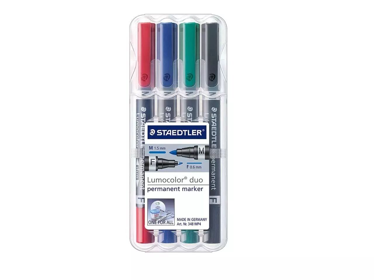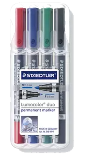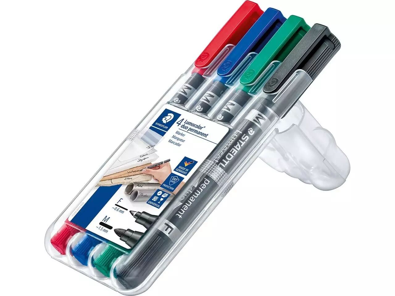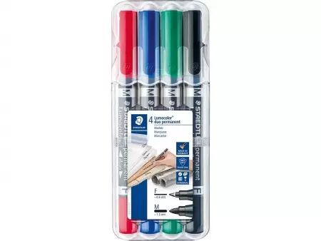 Quatre feutres «Lumocolor Duo» (bleu, rouge, vert et noir) dans un étui présentoir en PP.