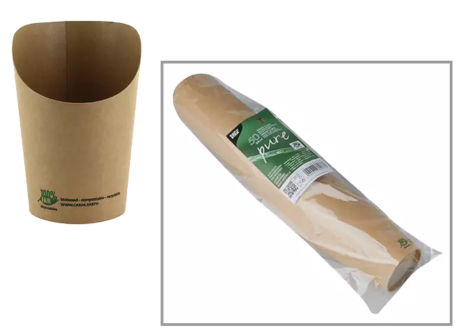 Innovante et durable, cette gamme d'emballages est fabriquée en carton fibres vierges, non blanchi certifié FSC®. Ils sont enduits d'une couche de bioplastique d'origine naturelle pour résister aux matières grasses et au chaud (PLA, issu de la transformation de l'amidon de maïs). Ils sont entièrement biodégradables, compostables et recyclables. Seuls des matériaux renouvelables rentrent dans leur composition.