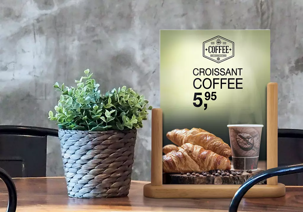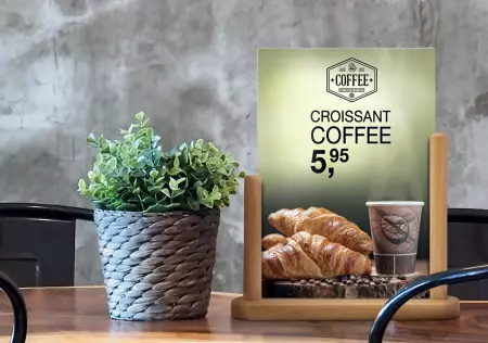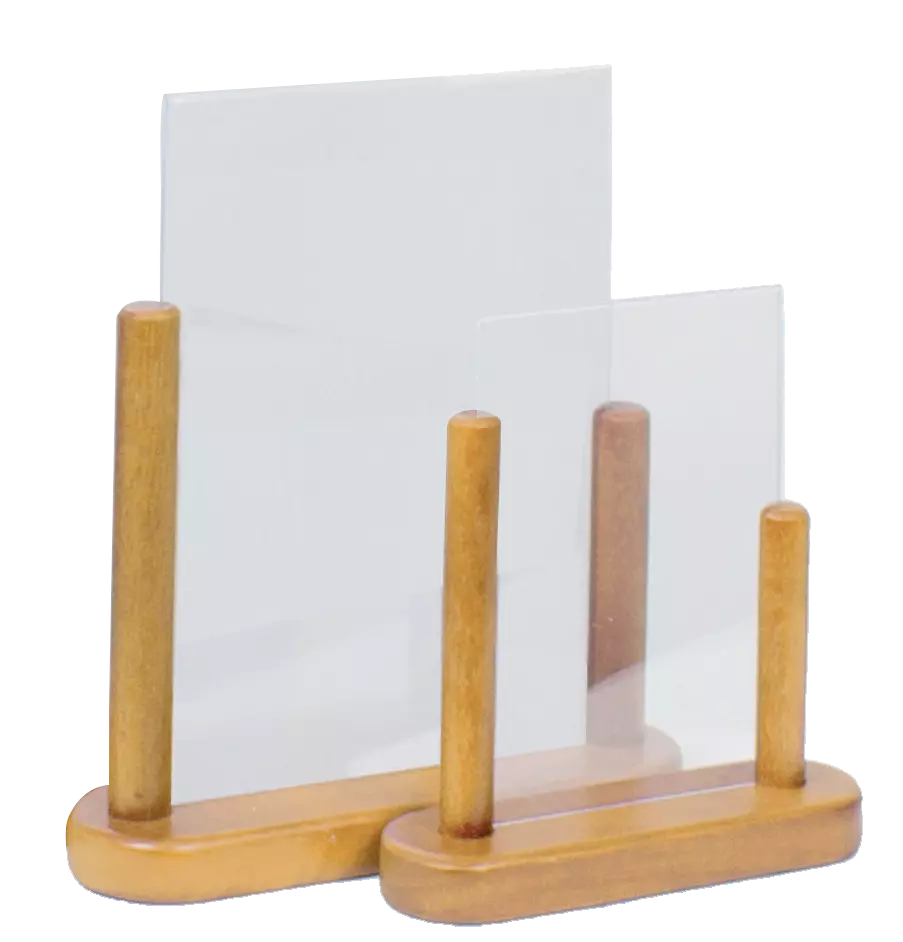 Support d'affichage de table avec une base amovible en bois, pour une présentation des deux côtés grâce au support acrylique double face permettant un insert d'une feuille de papier, d'un document... Disponible en deux formats, A4 ou A5. Document orienté à la verticale (type « portrait »).