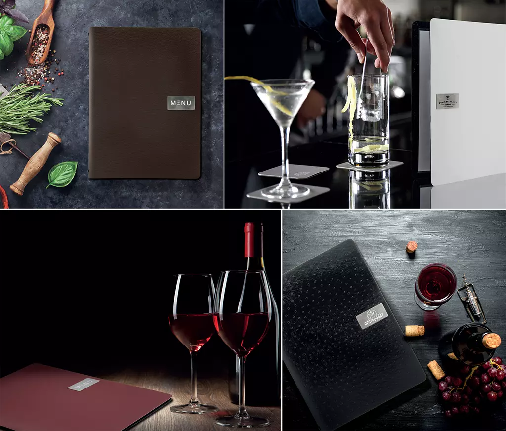 La couverture de ces élégants protèges-menus est en synderme naturel à 100% (cuir reconstitué), ce qui entraîne la production d'aucun déchêt. Ils sont faciles à nettoyer. Plaque en métal avec la mention «MENU». Une seconde plaque vierge est fournie, vous permettant de la faire graver ou imprimer à votre nom. Avec cordon élastique à l'intérieur pour l'ajout d'inserts (comprend d'origine 1 double insert, pochette transparente, pour 4 feuilles A4). Extensible jusqu'à 40 pages. Disponible en 6 coloris/textures.