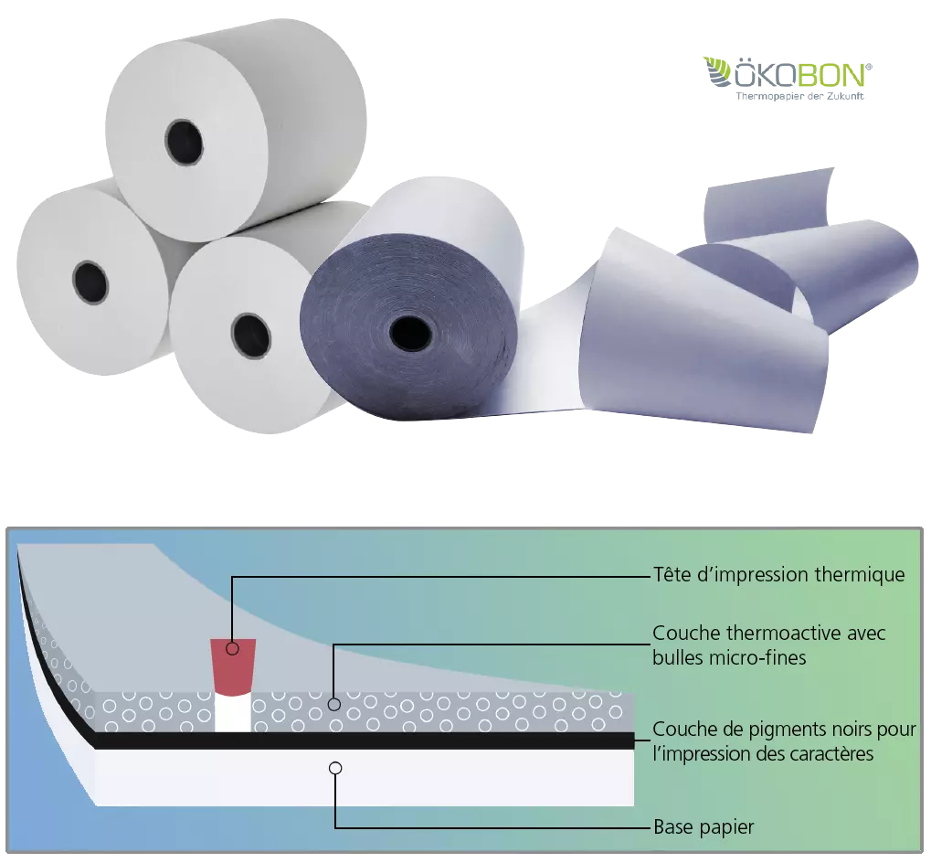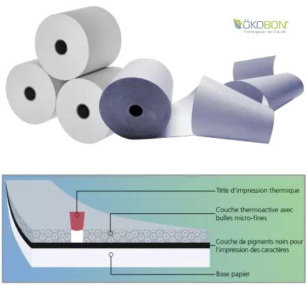 *Certaines imprimantes thermiques sont équipées de capteurs qui arrêtent le déroulement du papier au niveau d'une marque noire qui se trouve au dos du papier thermique. Pour utiliser ÖKOBON, il faut masquer ces capteurs (à l'aide d'une pastille adhésive opaque par exemple). De plus, il existe des imprimantes sur lesquelles il faut augmenter la pression, sinon, le résultat ne sera pas suffisamment contrasté (quel que soit le paramétrage en amont de l'imprimante).