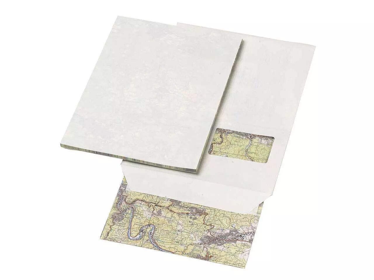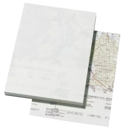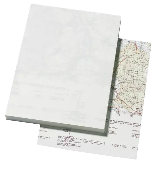 Feuilles A4 100 g/m² avec motif carte d'état-major au dos. Livrées dans une enveloppe C4, par 50.