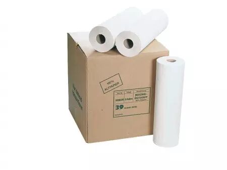 Draps d'examen crêpés en papier 100% recyclé, blanc naturel (c'est à dire beige, marron clair), en une seule couche résistante. Les draps sont perforés tous les 40 cm et conviennent à tous les dérouleurs courants. Longueur du rouleau : 50 m, disponible en 3 largeurs de draps : 39 cm, 50 cm, 59 cm.