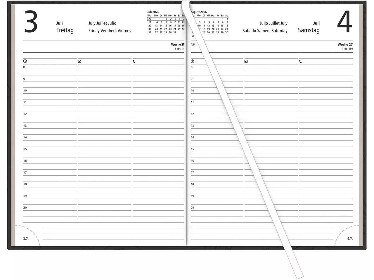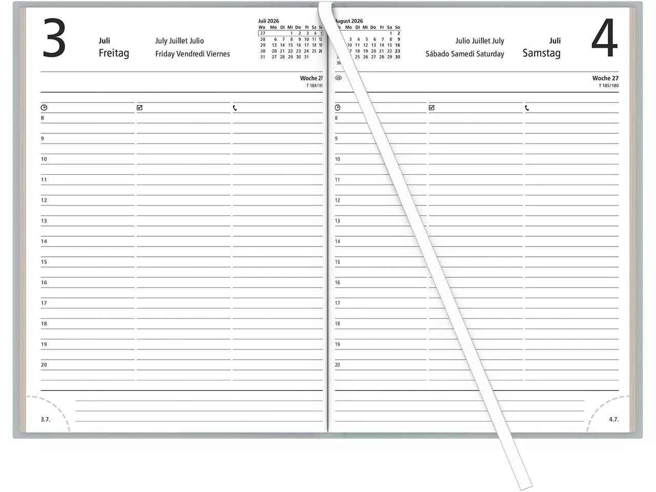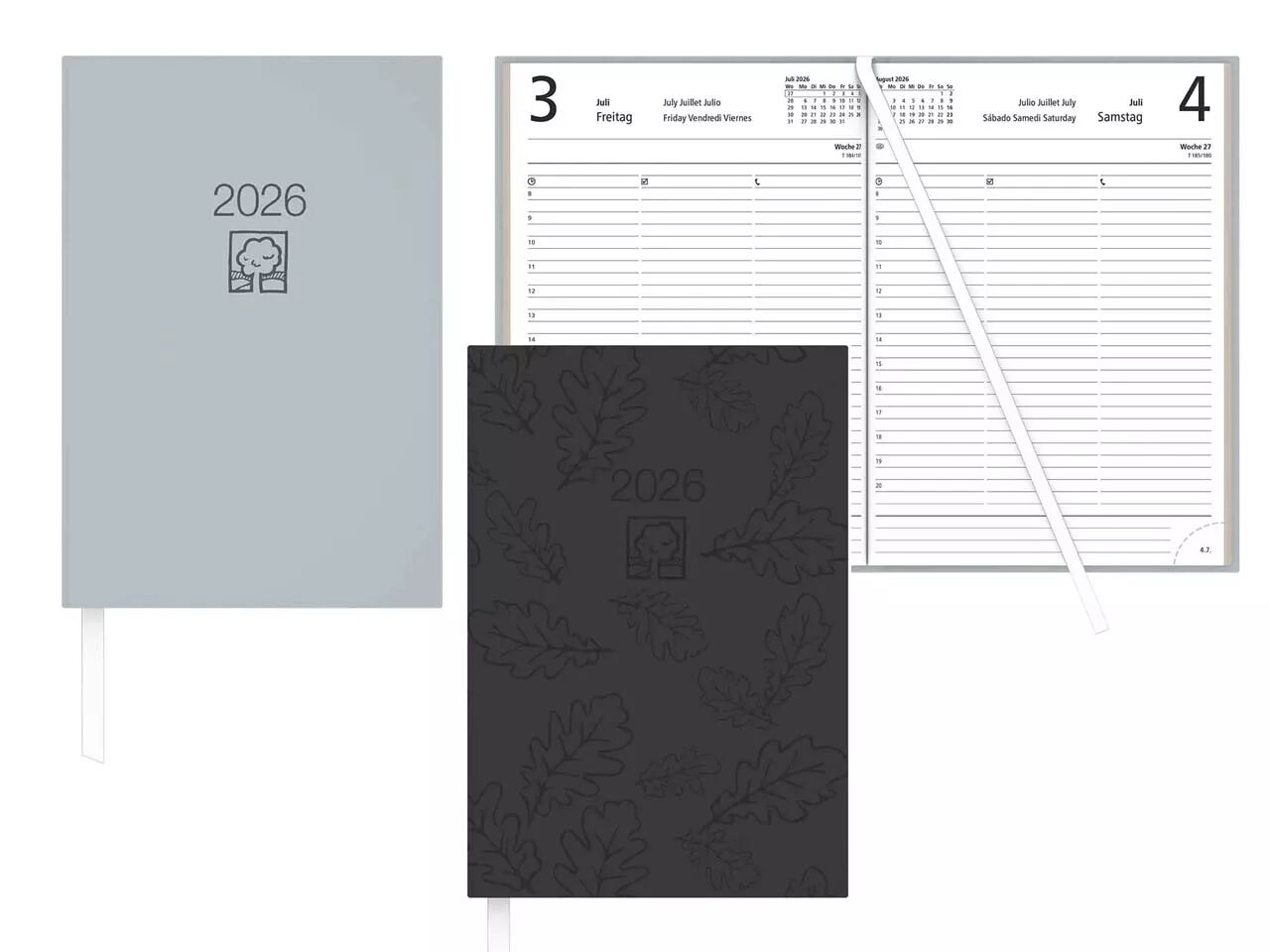 Agenda de qualité supérieure en papier recyclé certifié Ange bleu. 392 pages au format A5 (L15 x H21 cm). Une page pour chaque jour, y compris les dimanches et jours fériés marqués différemment. Coins perforés pour être détachés et former un onglet d'accès direct au jour en cours, marque pages, numéro du jour, de la semaine et nombre de jours écoulés/restants pour l'année civile, vue d'ensemble bimensuelle pratique.¤En 4 langues : allemand, anglais, français, italien (remarque : langue allemande prédominante).¤Les heures sont divisées en plage de 30 minutes, de 8h00 à 20h00.