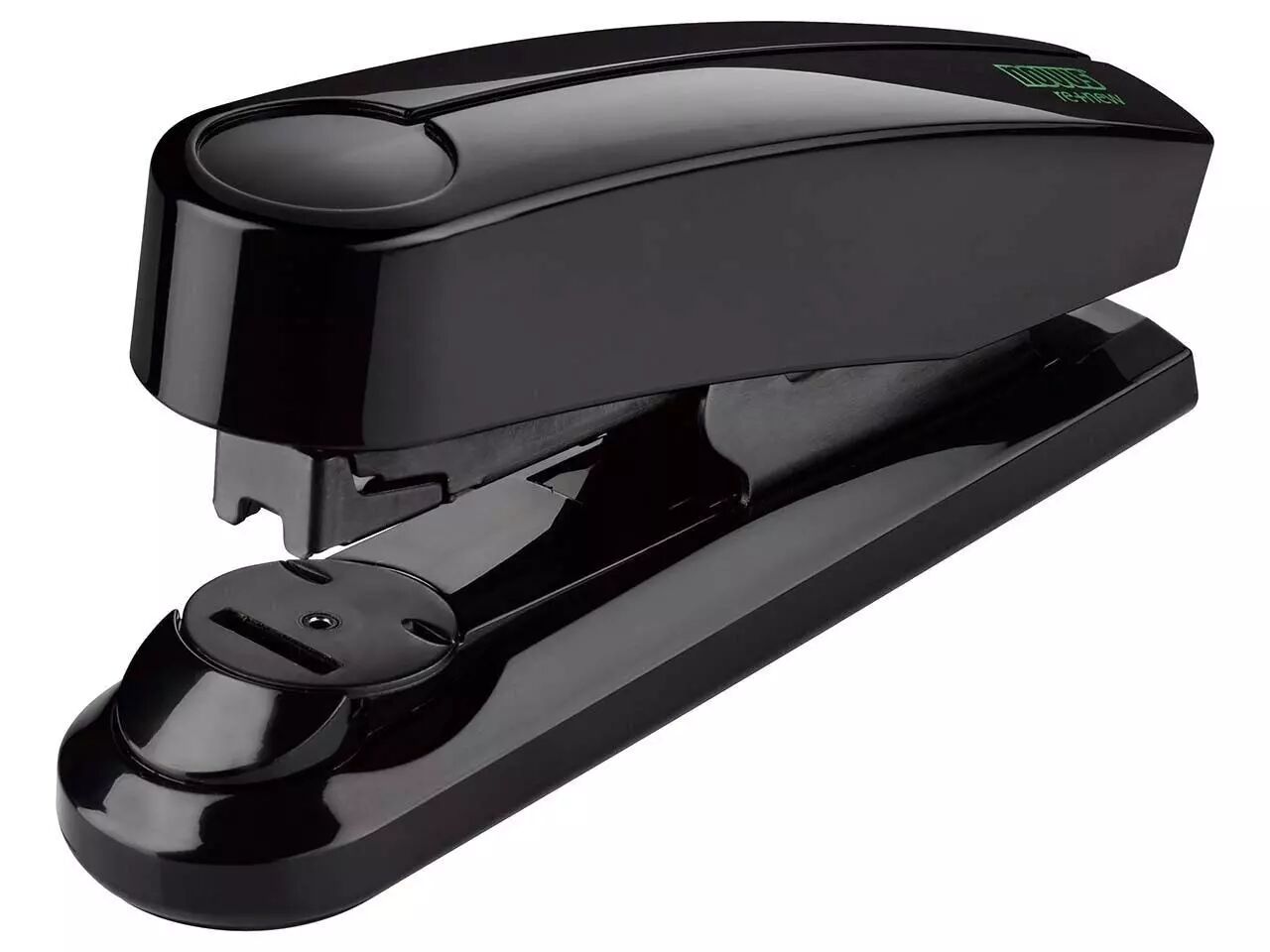 Agrafeuse de table, faite à 80% de plastique recyclé, avec une capacité d'agrafage jusqu'à 40 feuilles avec une agrafe 24/8. Peut contenir 100 agrafes 24/6 ou 24/8. Fournie avec 200 agrafes 24/6. L15,9 x P4 x H7,7 cm.