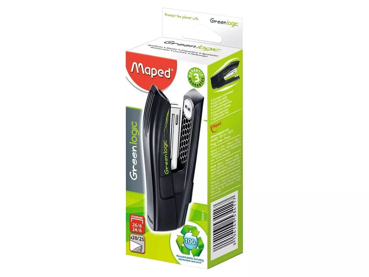 Difficile d'imaginer un bureau sans cette agrafeuse ! Ses parties en plastique sont fabriquées à 100 % à partir de plastique recyclé. Elle peut contenir 100 agrafes de type 24/6 ou 130 agrafes de type 26/6. Permet d'agrafer jusqu'à 25 feuilles. La profondeur d'insertion maximale est de 53 mm. Garantie constructeur de 3 ans. L15,7 x P6,5 x H4,1 cm.