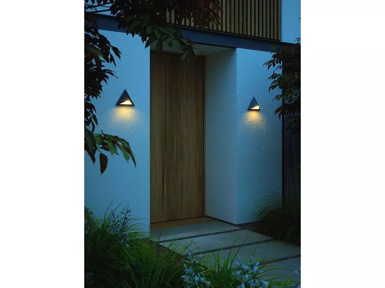 Cette applique murale pour l'extérieur se distingue par son design moderne et géométrique, avec son abat-jour tétraédrique. Sa forme particulière permet à la lumière d'être diffusée élégamment vers le bas, créant ainsi un éclairage agréable et ciblé (vous évitez du reste de participer la pollution lumineuse de votre quartier !). L'applique murale avec douille GU10 est livrée sans ampoule, ce qui permet de l'équiper selon les préférences de chacun. Le luminaire est idéal pour l'extérieur et apporte une touche contemporaine au jardin, à la terrasse ou à l'entrée. Elle peut aussi être installée en position basse pour baliser avec style un chemin.