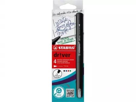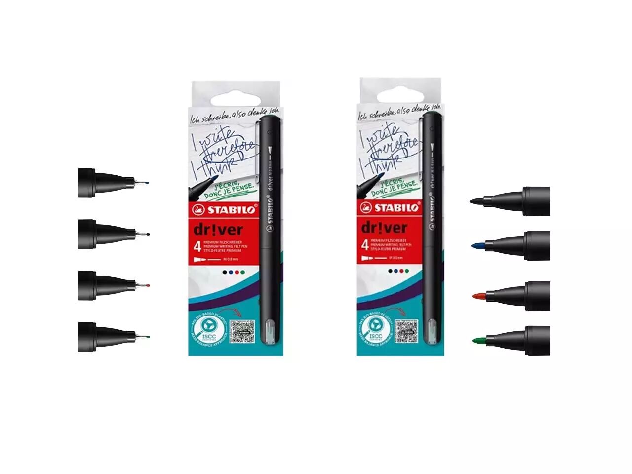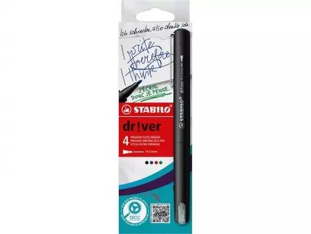 Ce set pratique contient quatre feutres fins "dr!ver" de couleurs assorties. Grâce à leur zone de préhension souple et antidérapante, les stylos feutre sont agréables à tenir en main. Leur pointe précise garantit des traits clairs et nets - parfaits pour des dessins détaillés, des esquisses ou une écriture propre. Leur corps est fabriqué à 94 % en plastique biosourcélisé. Ces stylos-feutres ne sont pas rechargeables. Étui carton de 4 feutres de couleurs assorties : noir, bleu, rouge et vert, en pointe fine ou moyenne.