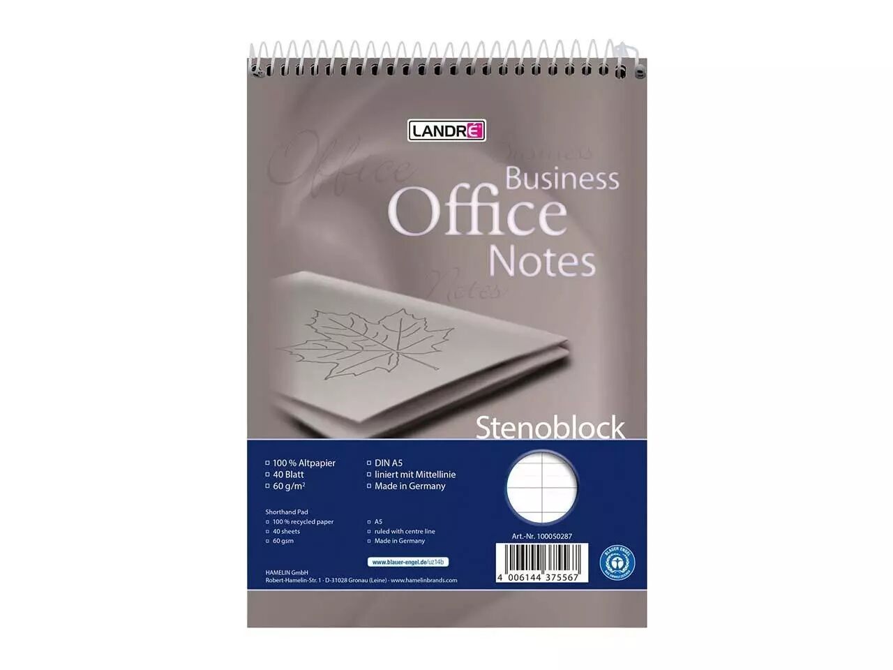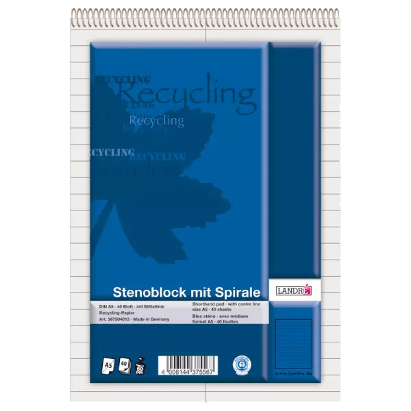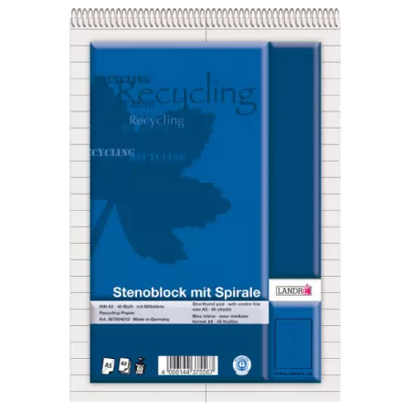 Bloc sténo 100% recyclé, label écologique « Ange Bleu ». Format A5, 40 feuilles, ligné + trait vertical rouge de séparation en milieu de page.