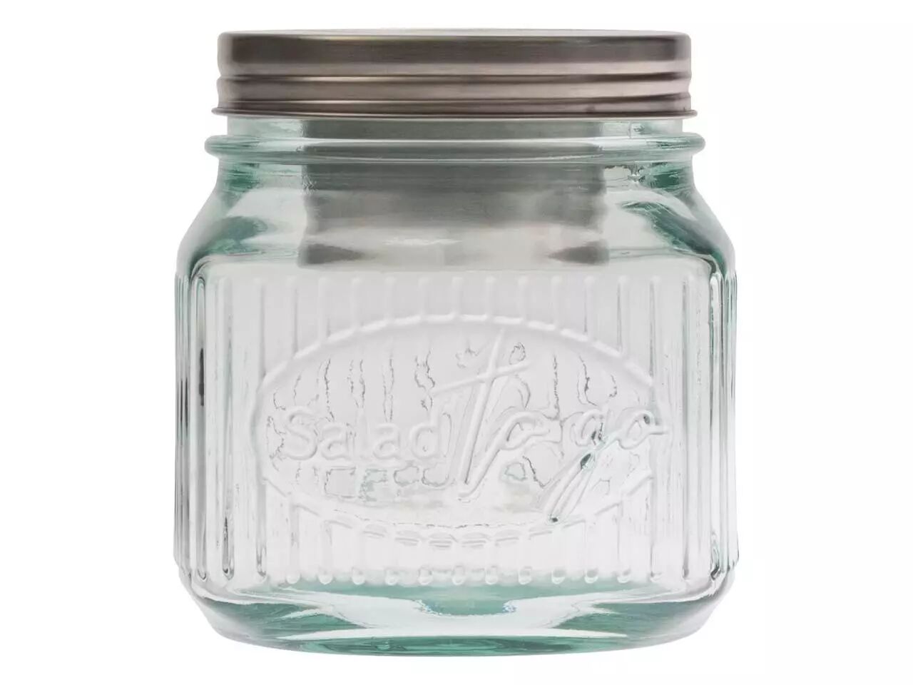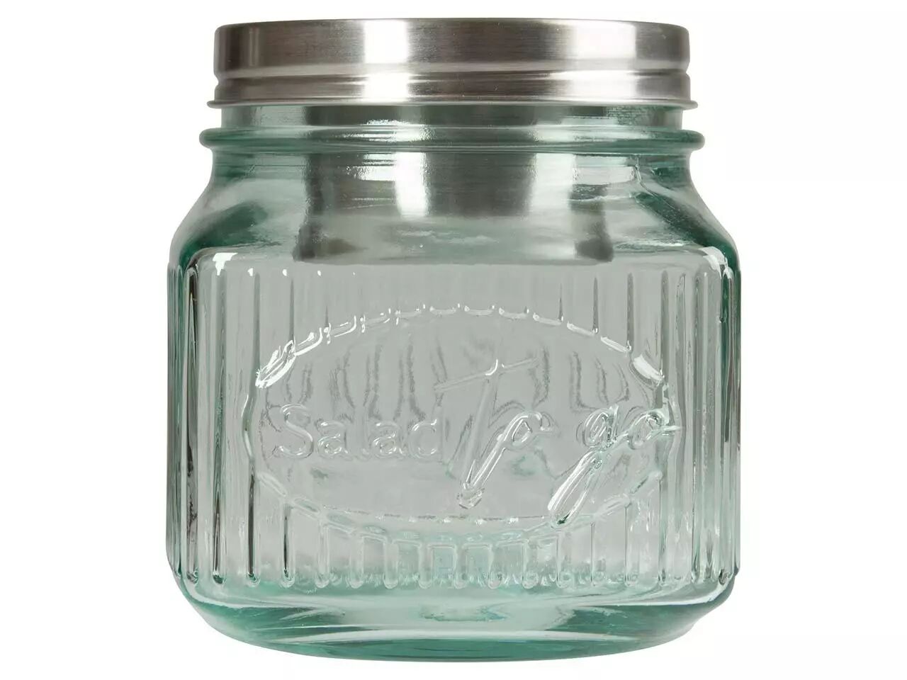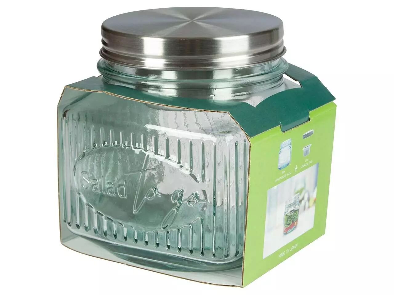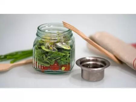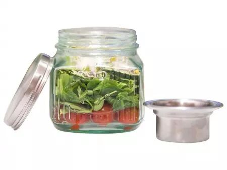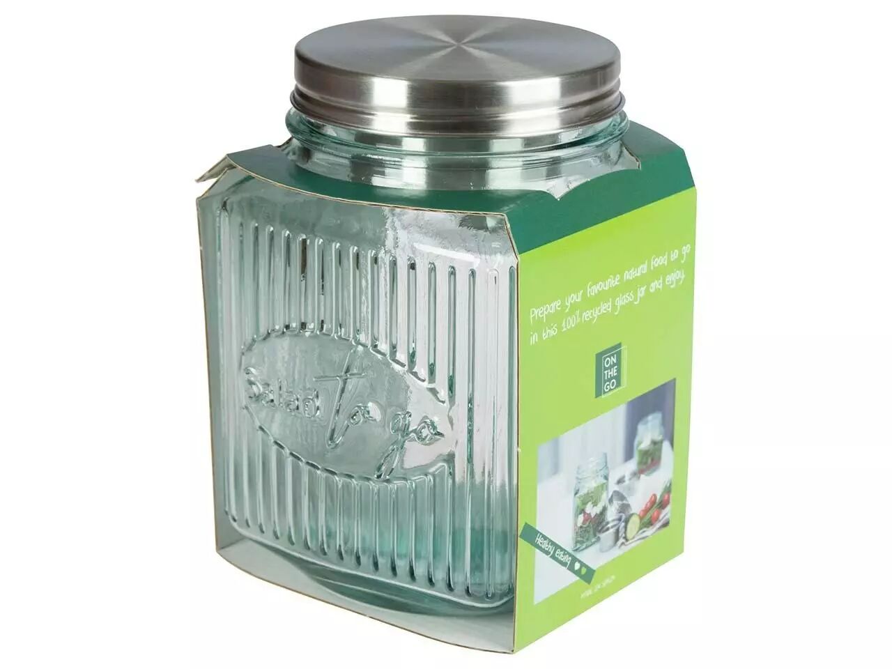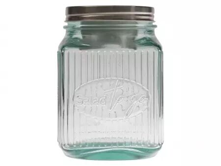 En verre recyclé pour savourer votre salade préférée partout et à toute heure. Le récipient à vinaigrette en acier inoxydable intégré dans son couvercle permettra à votre salade de garder son croquant jusqu'au moment de la déguster.