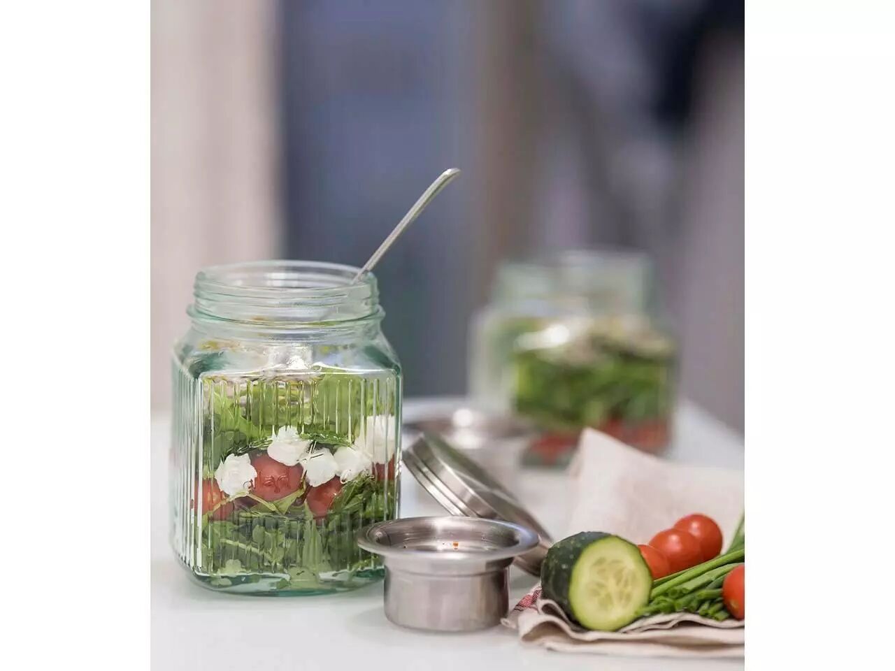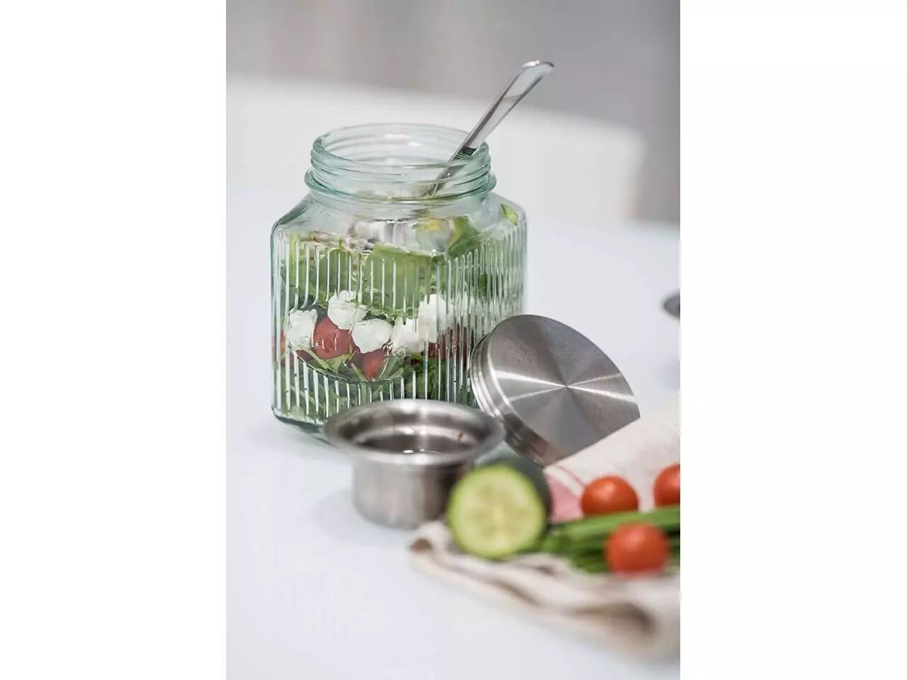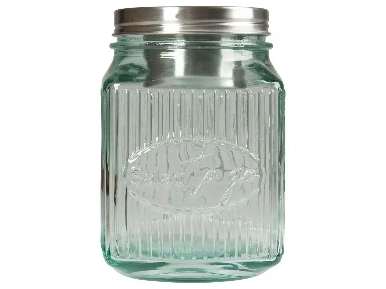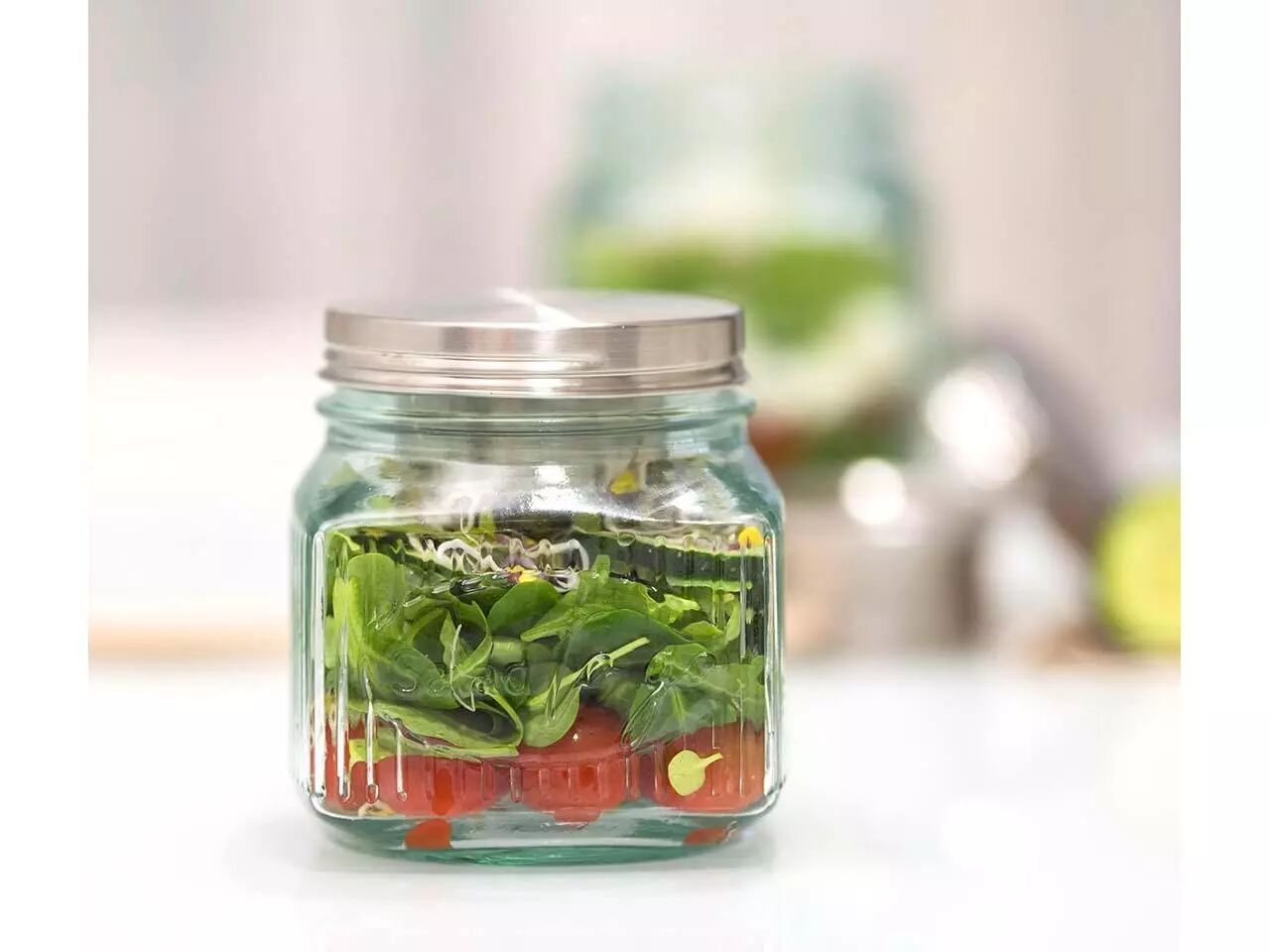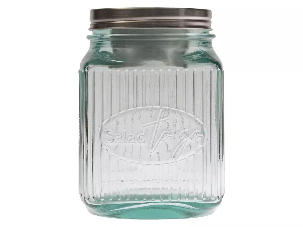 En verre recyclé pour savourer votre salade préférée partout et à toute heure. Le récipient à vinaigrette en acier inoxydable intégré dans son couvercle permettra à votre salade de garder son croquant jusqu'au moment de la déguster.