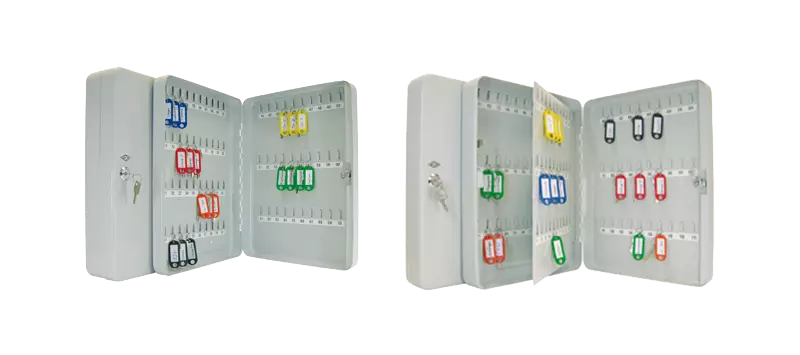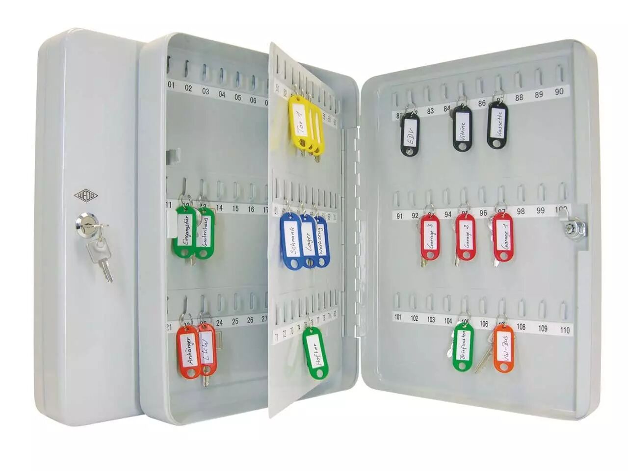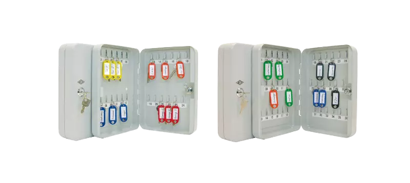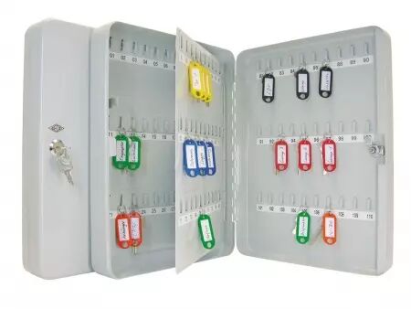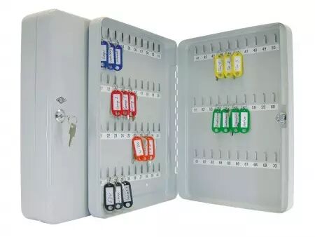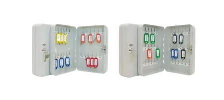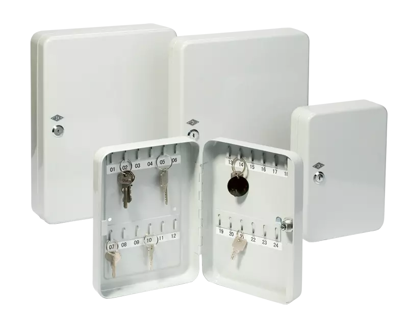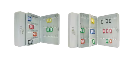 Boîte solide en métal pour ranger et conserver vos clés en sécurité. En tôle d'acier de qualité, laquée. Chaque boîte est munie d'une serrure de sûreté et de crochets fixes (de 24 à 110 crochets à clés selon le modèle). Parois arrière pré-percées, livrée sans nécessaire de fixation. Couleur gris clair (RAL 7035). Livrée avec 2 clés pour verrouiller la boîte.