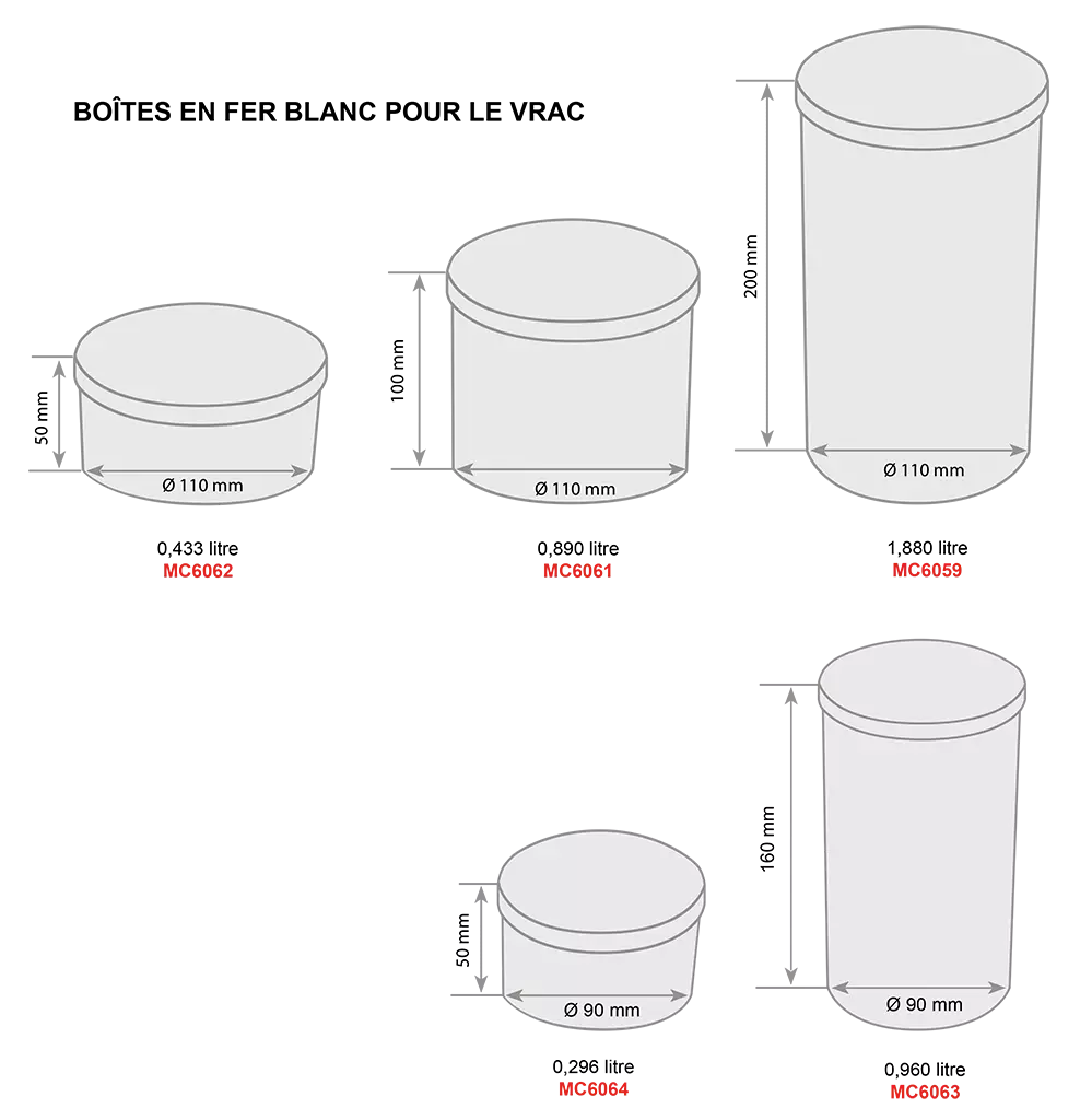 Ces boîtes en fer blanc, type boîtes à biscuits, garanties contact alimentaire (produits secs et/ou gras), sont idéales pour le transport et le stockage des aliments vendus en vrac.