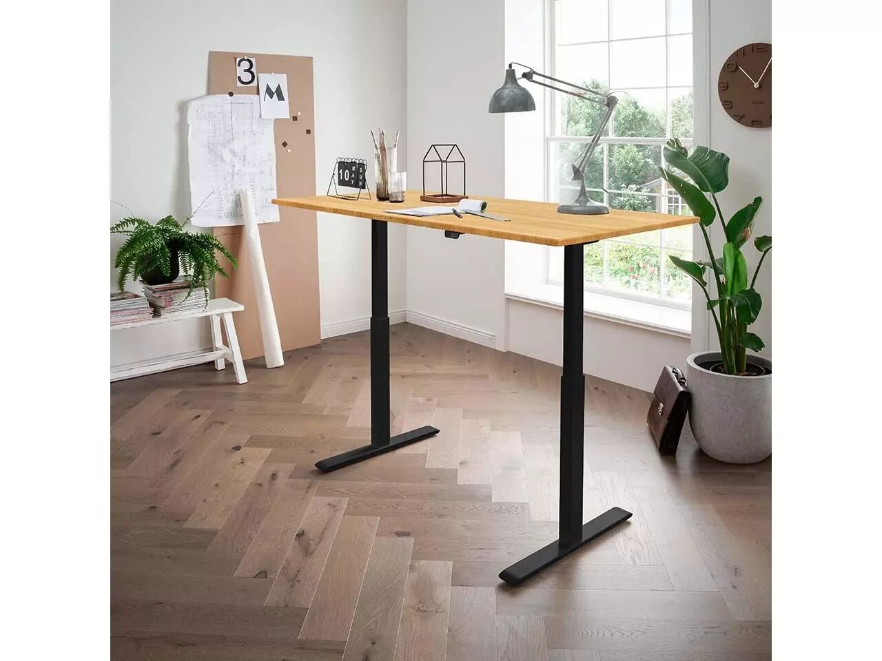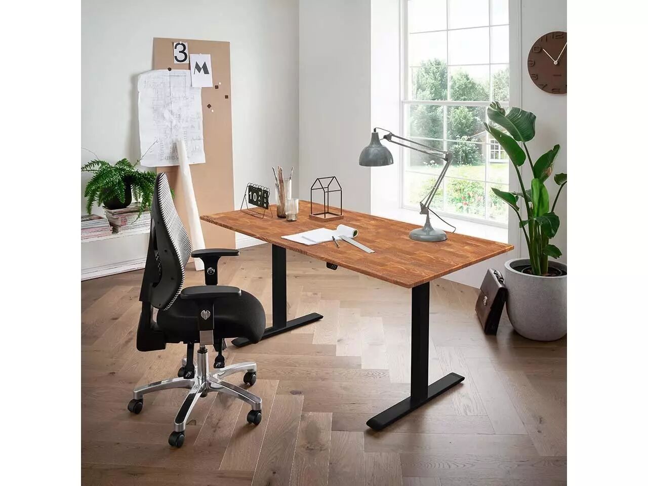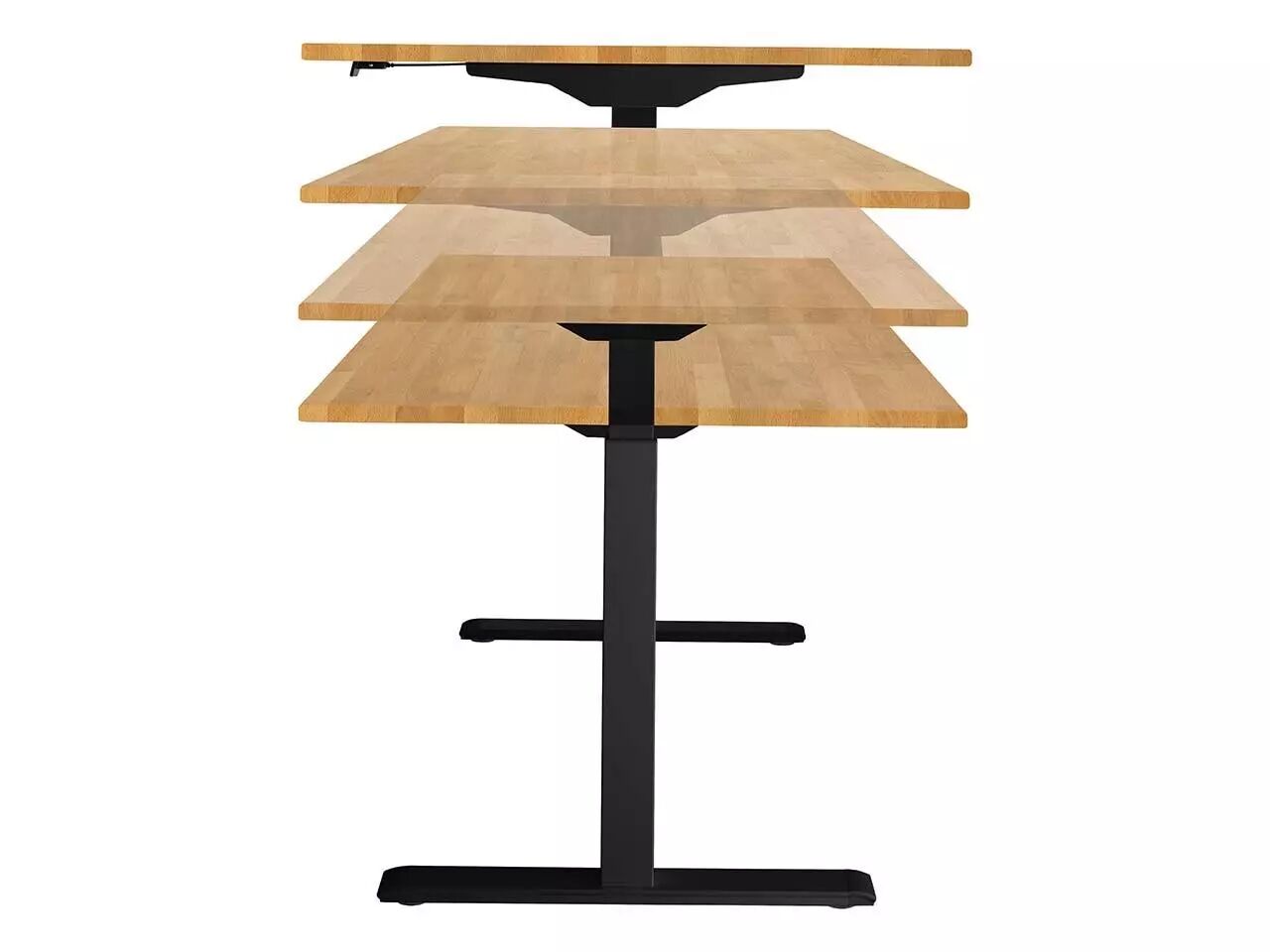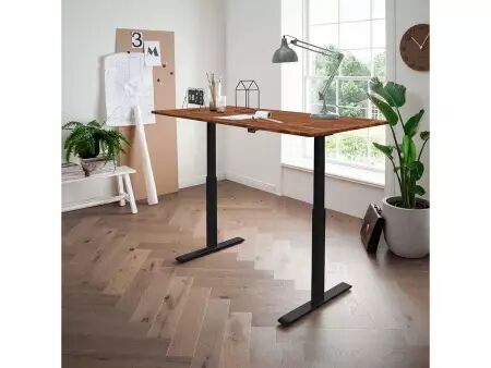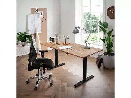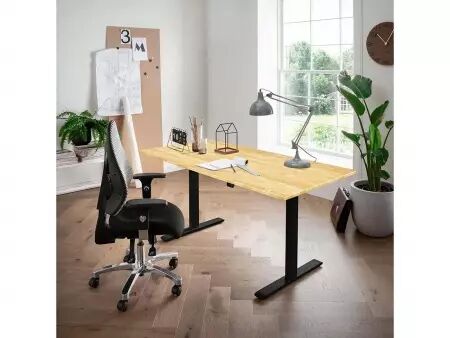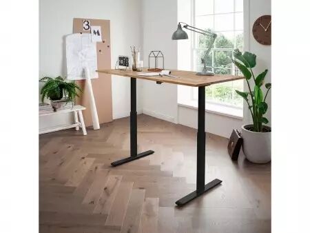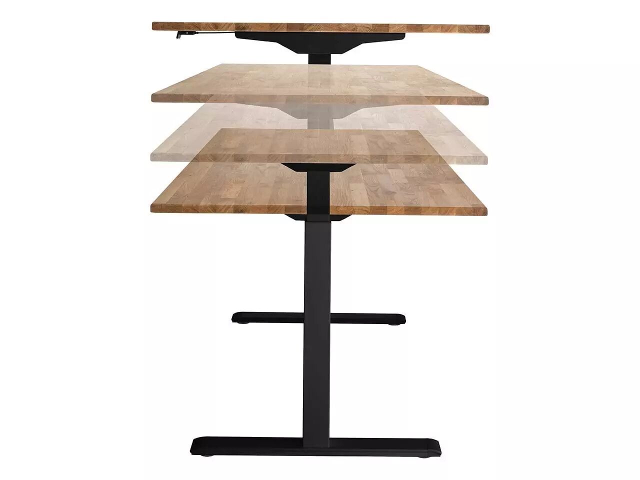 Travailler alternativement debout et assis est particulièrement ergonomique et permet une meilleure concentration au travail. Le réglage en hauteur de ce bureau est très facile grâce à la motorisation de haute qualité (double moteur Bosch). La hauteur peut être réglée de 70 à 120 cm, ce qui permet à chaque utilisateur d'être parfaitement assis à son bureau. Pratique : la hauteur préférée peut être enregistrée grâce à la fonction mémoire. Le design du bureau debout/assis est minimaliste : le piètement en T peu encombrant, d'un noir sobre, offre de la place pour ranger un caisson à roulettes, par exemple, et s'harmonise parfaitement avec le plateau de table en bois massif huilé certifié FSC. Choisissez librement votre essence de bois préférée : du bouleau huilé ou lasuré blanc pour sa clarté, la couleur rougeâtre du bois de hêtre, jusqu'au ton soutenu du robinier massif, ou le classicisme du chêne . Créez l'atmosphère qui vous convient ! Profondeur 80 cm, disponible en sept largeurs différentes, de 100 cm à 180 cm.