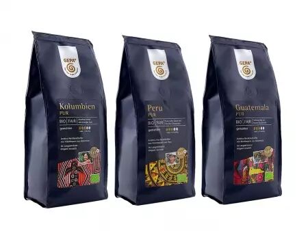 Les nouveaux cafés de GEPA, le pionnier du commerce équitable, proviennent des meilleures plantations du globe. Les cerises de café arabica à l'arôme puissant, cultivées biologiquement à haute altitude, ont été cueillies très soigneusement à la main une fois arrivées à maturité complète. Lentement torréfiées et finement moulues pour savourer pleinement toute la saveur du café.