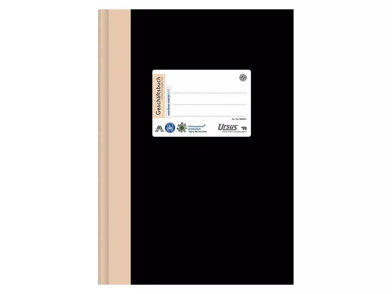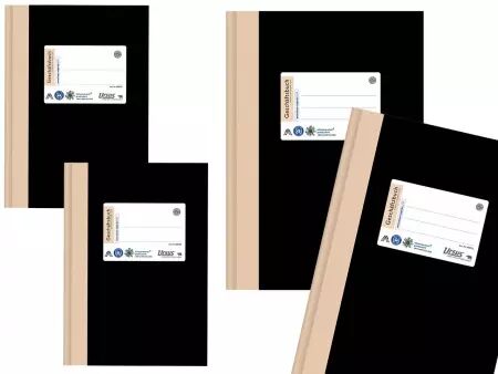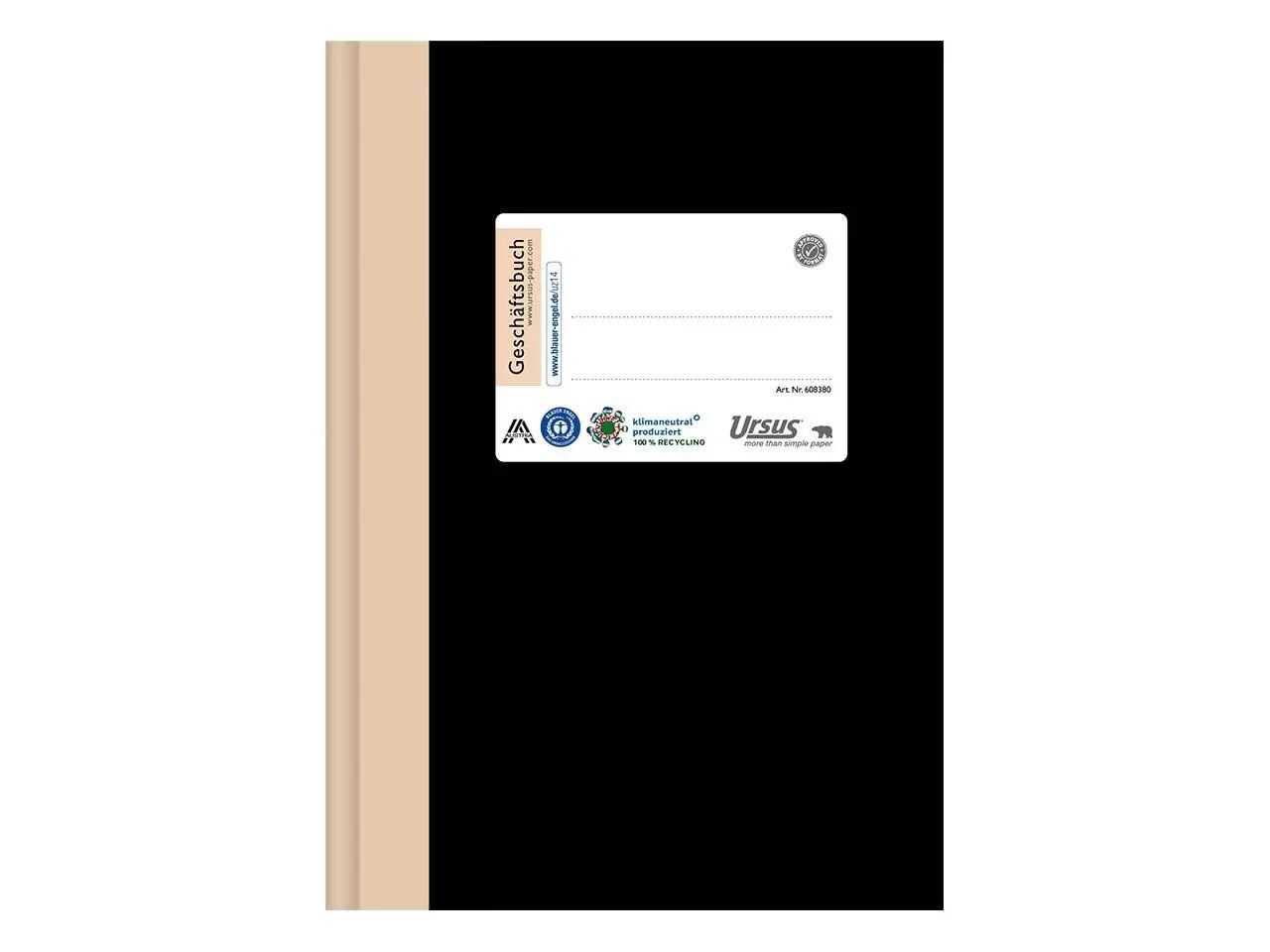 Carnets et chaiers de notes en papier recyclé avec ruban marque-page. La couverture noire et résistante du carnet de notes UrsusGreen est particulièrement élégante. La reliure toilée lin et cousue prolonge la durée de vie et permet de maintenir les pages ensemble de manière indissociable. Ils sont dotés d'un ruban marque-page pratique. La couverture est en papier cartonné de 150 g/m² et dispose d'une étiquette qui permet de donneer un titre au carnet. Les feuilles de papier recyclé avec label Ange Bleu ont un grammage de 80 g/m². Disponible au format A5 et A4, avec plusieurs nombres de pages et différents lignages.