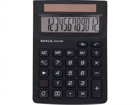 La calculatrice de poche Maul Eco 650 fonctionne à l'énergie solaire et son boîtier est composé à 80 % de plastique recyclé : ces atouts lui valent de bénéficier du label Ange bleu. Elle ne requiert que 50 lux d'intensité lumineuse pour fonctionner, et s'éteint automatiquement après une période d'inactivité. Outre les fonctions de calcul de base, l'appareil permet le calcul des pourcentages, le changement de signe et le calcul des racines carrées. Un affichage avec séparation des milliers, une touche double zéro ainsi que 4 touches de fonctions mémoires complètent ses caractéristiques. Dimensions L104 x P145 x H33 mm.