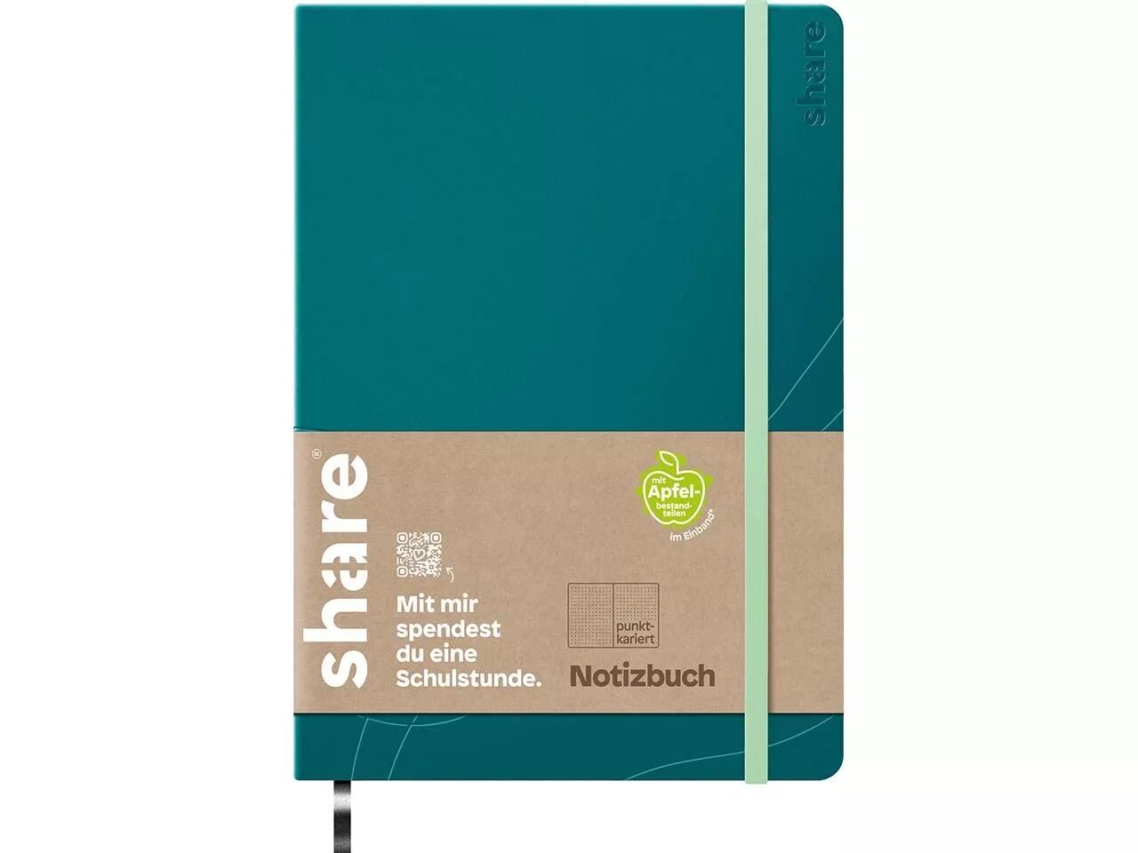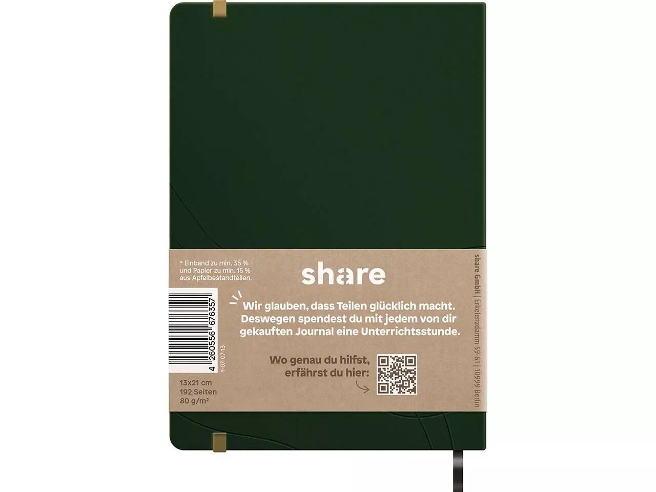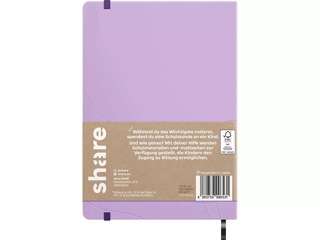 Carnet de notes ou de dessin de format A5, Share, de 192 pages. Le papier et la couverture souple à l'aspect cuir contiennent au moins 35 % de composants issus de la pomme. Oui, vous avez bien lu : ce qui rend ce carnet tout à fait unique. Le papier blanc crème présente un quadrillage à points, 32 des 192 feuilles sont perforées et peuvent donc être facilement détachées. Un marque-page et un élastique de fermeture facilitent l'organisation quotidienne. L'organisation Share soutient des projets éducatifs pour les enfants en Ouganda. Plusieurs coloris disponibles.
