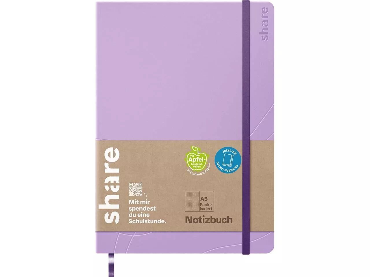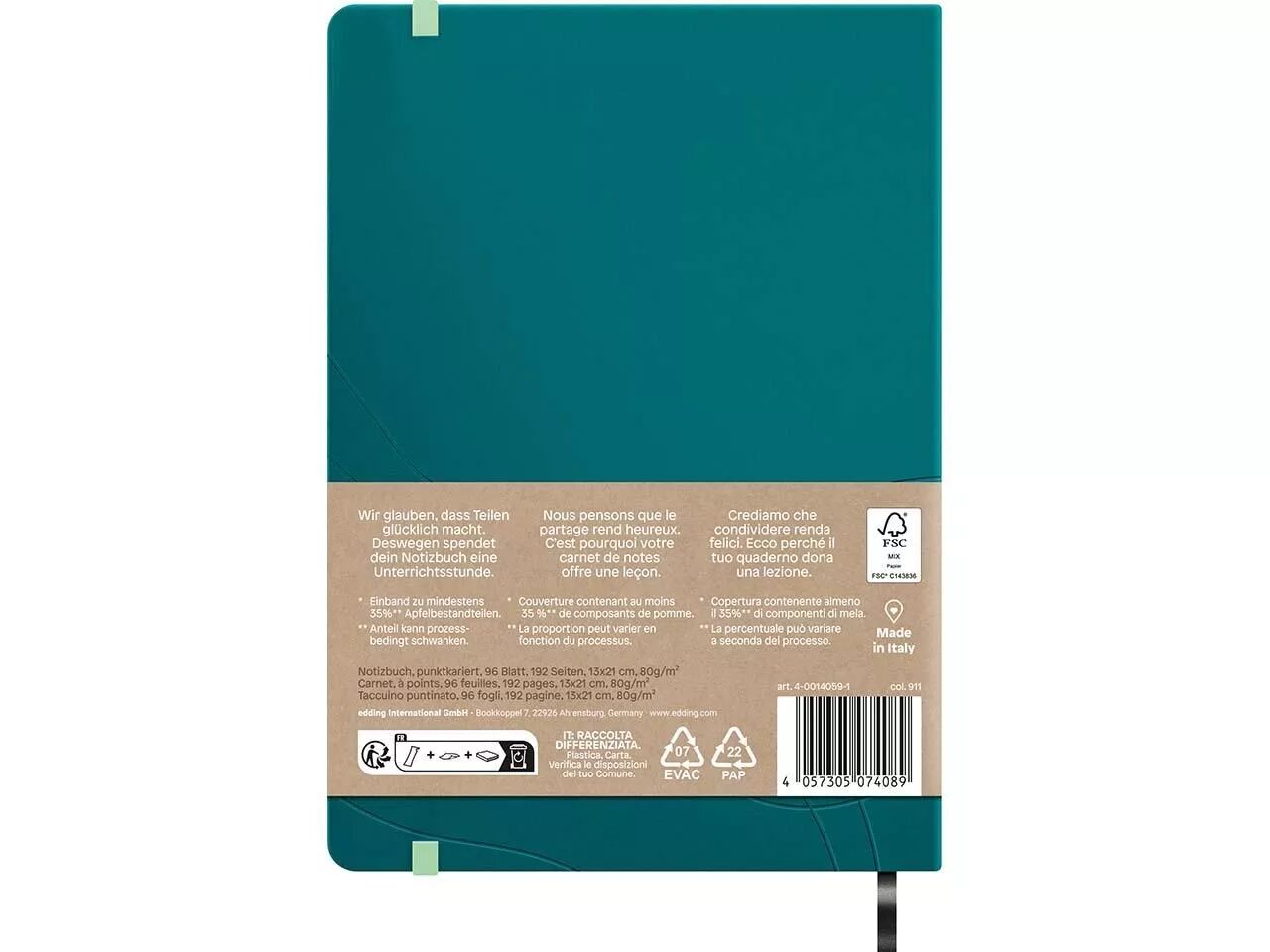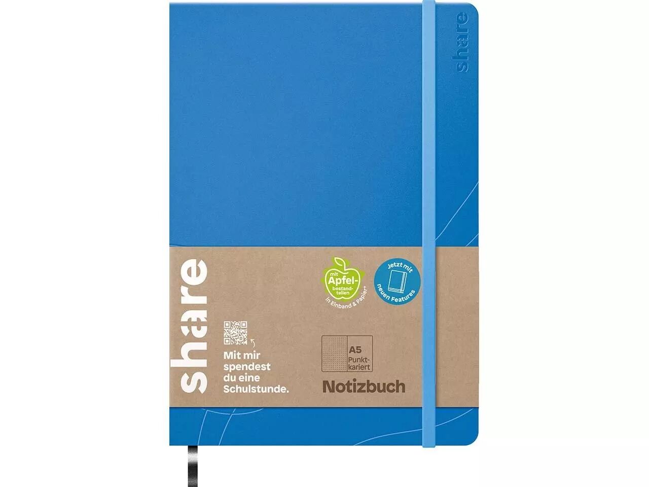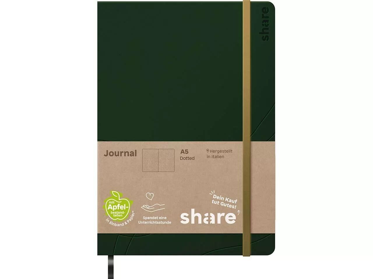 Carnet de notes ou de dessin de format A5, Share, de 192 pages. Le papier et la couverture souple à l'aspect cuir contiennent au moins 35 % de composants issus de la pomme. Oui, vous avez bien lu : ce qui rend ce carnet tout à fait unique. Le papier blanc crème présente un quadrillage à points, 32 des 192 feuilles sont perforées et peuvent donc être facilement détachées. Un marque-page et un élastique de fermeture facilitent l'organisation quotidienne. L'organisation Share soutient des projets éducatifs pour les enfants en Ouganda. Plusieurs coloris disponibles.