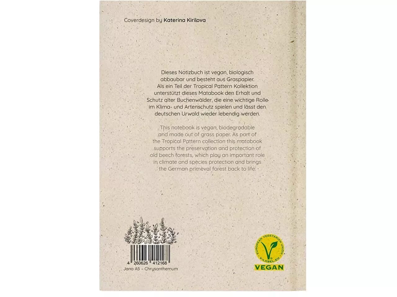 Carnet à croquis de format A5 pour dessiner, noter vos idées, réaliser votre journal quotidien.¤Le papier de ce carnet est composé de 50% de fibres d'herbes. La partie fibre vierge provient de forêts certifiées FSC®. Ce papier est compatible avec toutes sorte de stylos.¤Le carnet fait partie de la collection Tropical Pattern, qui soutient la préservation et la protection des forêts de hêtres anciennes en Allemagne. Papier uni ou ligné, grammage 90 g/m², 276 pages avec lacet marque-page. Le modèle ligné dispose également d'un élastique qui maintient le carnet fermé.