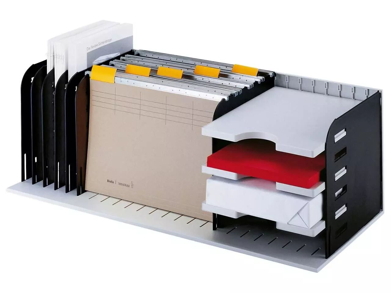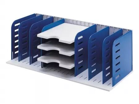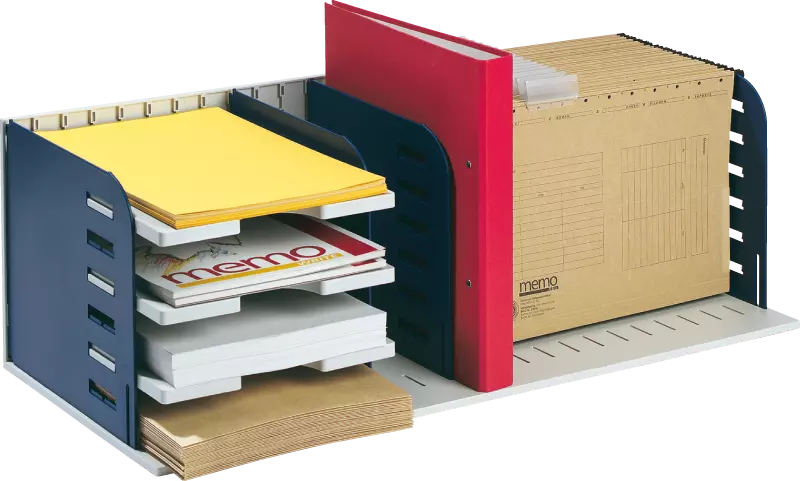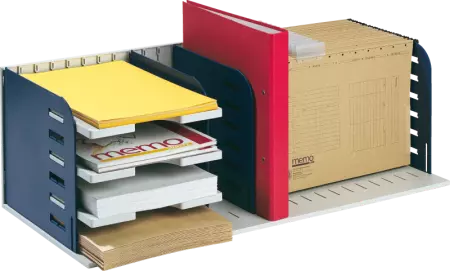 «Styrorac» assure un meilleur rangement et plus de visibilité. Le système de casiers multi-fonctions (à l'horizontale et à la verticale) offre plusieurs possibilités de rangement : range-revues, trieur de courrier et bac à dossiers suspendus. Vous confectionnez vous-même vos différents rangements en fonction de vos besoins. Le système est conçu pour une utilisation optimale de la place disponible par des séparations et des tablettes.