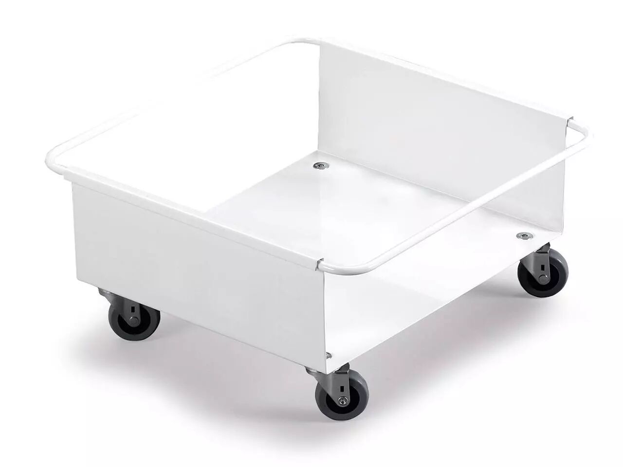 Chariot en métal laqué blanc avec quatre roulettes directionnelles.