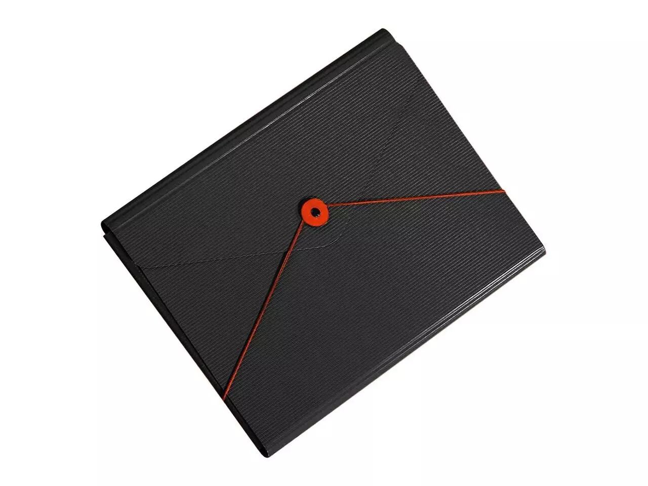 Contenance jusqu'à 1,5 cm de documents au format A4, rabat principal avec bouton fermoir avec élastique, rabats intérieurs avec fente pour cartes de visite et porte stylo en élastique toilé. Carton fort 1,5 mm 100% recyclé.