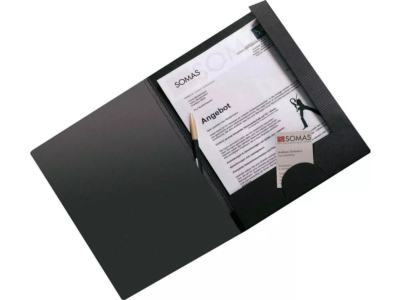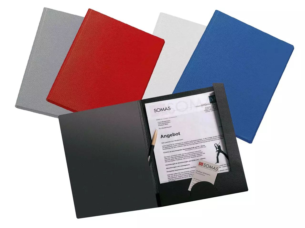 Chemise dossier, 100% carton recyclé d'épaisseur 1 mm, label écologique « Ange Bleu ». Avec 2 rabats, une pochette carte de visite, une fixation stylo. Épaisseur des documents jusqu'à 1 cm au format A4.