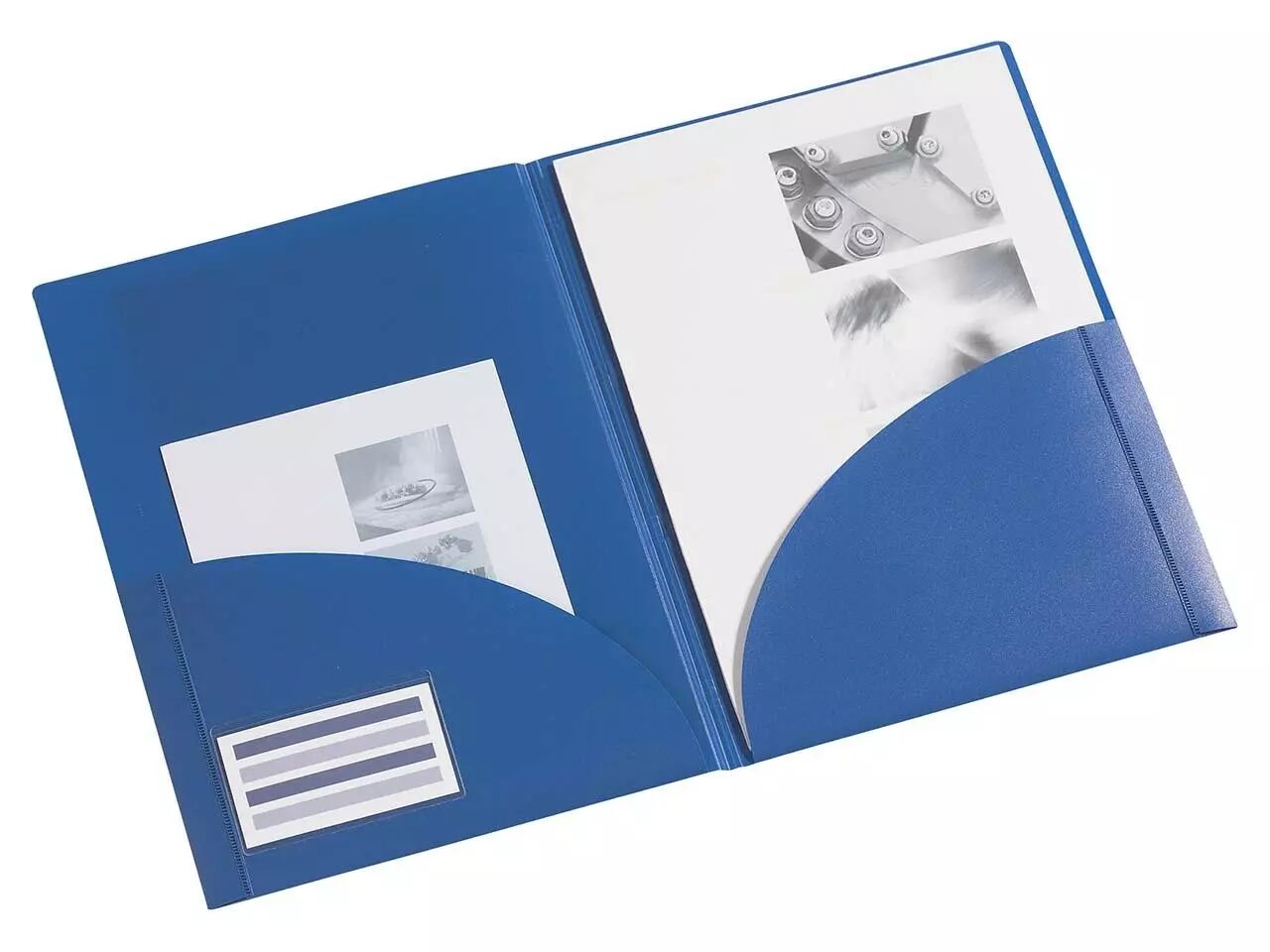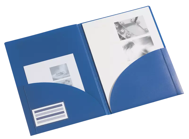 Une chemise en polypropylène recyclable, à la vie intérieure très riche : deux grandes poches quart de cercle offrent de la place pour les prospectus et les documents. Détails pratiques : des rangements pour cartes de visite à l'intérieur et quatre rabats d'archivage escamotables dans le dos de la chemise pour ranger celle-ci dans un classeur à anneaux ou un dossier. Dos rainuré. Pour format A4. Epaisseur 0,5 mm. Dimensions L 22,5 x h 30,5 cm. Contenance environ 40 pages. Surface publicitaire environ 190 x 260 cm.