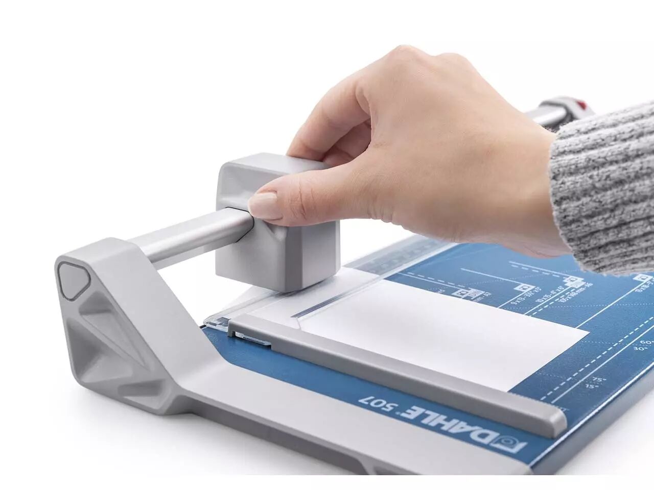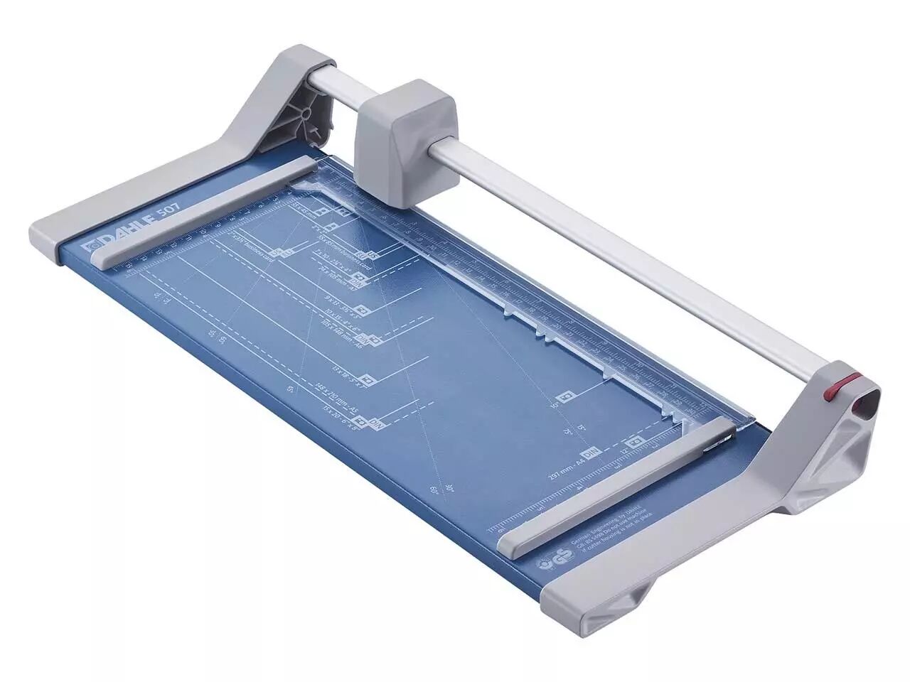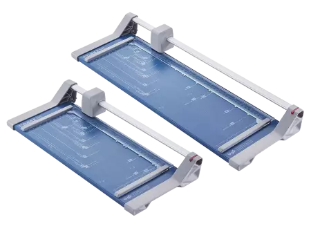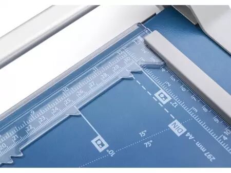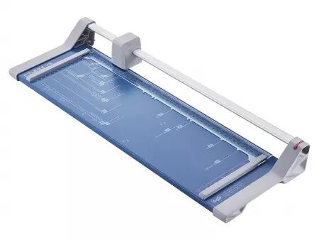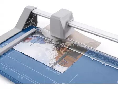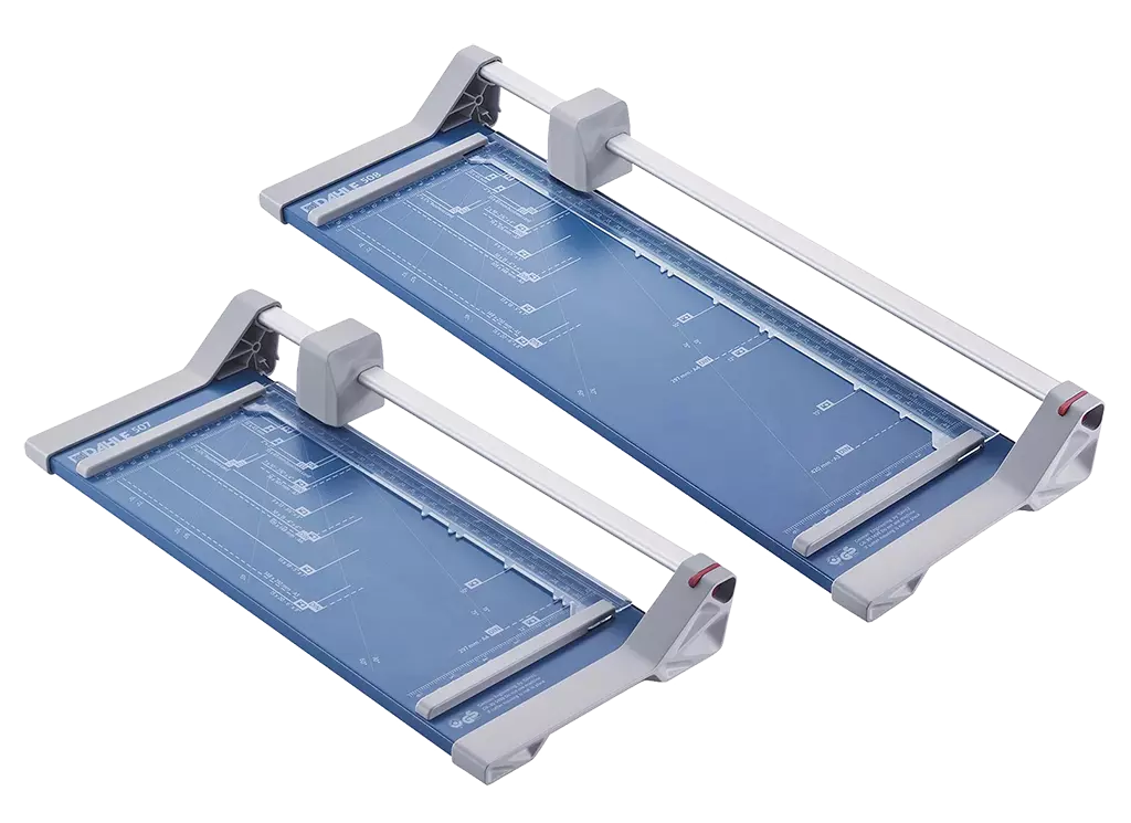Les cisailles à couteau rotatif Dahle 507 et 508 ont un chassis en acier stable et durable. Leurs pieds en caoutchouc antidérapants assurent une bonne adhérence au plan de travail. Ces rogneuses permettent de couper rapidement et précisément le papier, les photos et le papier cartonné. La base est graduée en cm et en pouces, et présente les formats courants (DIN, photos et degrés). La pression au point de coupe est automatique. La règlette de maintien des feuilles dispose de deux butées latérales graduées en cm d'aide au positionnement. La machine est équipée d'un couteau circulaire en acier rectifié, logé un carénage plastique hermétique. Capacité de coupe de 8 feuilles (80 g/m²). Disponibles pour format A4 et A3.