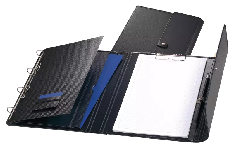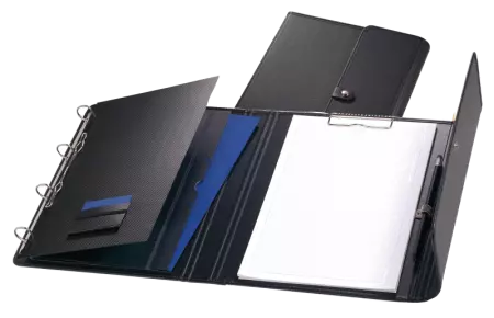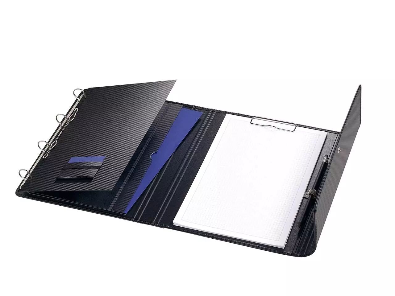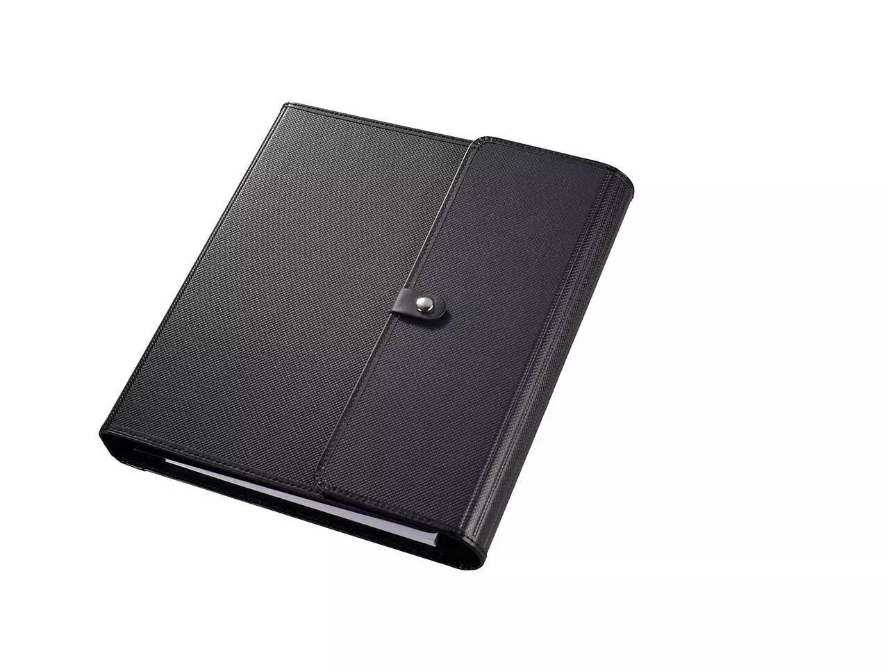 Elégant, solide et plein d'accessoires : fermeture par bouton pression, ruban de fermeture noir, courroie en cuir recyclé, pince porte-bloc métallique, compartiment à cartes de visite, mécanisme à 4 anneaux avec plaque de rangement, porte-stylos métallique, compartiment supplémentaire élastiqué. Dimensions à vide environ L 29 x p 32 x h 3 cm. Surface publicitaire environ 100 x 40 mm.