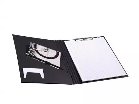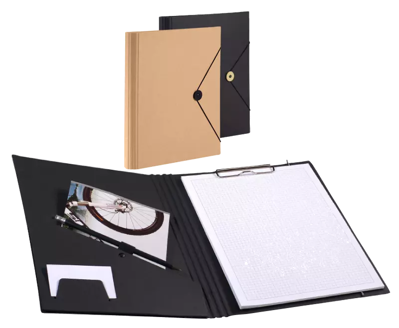 Pince porte-bloc métallique solide, porte-stylo, compartiment à cartes de visite, compartiment d'angle et bouton de fermeture avec élastique. Pour format A4. Dimensions L24 x h 32 cm.