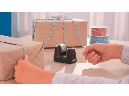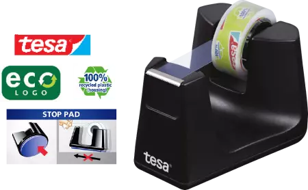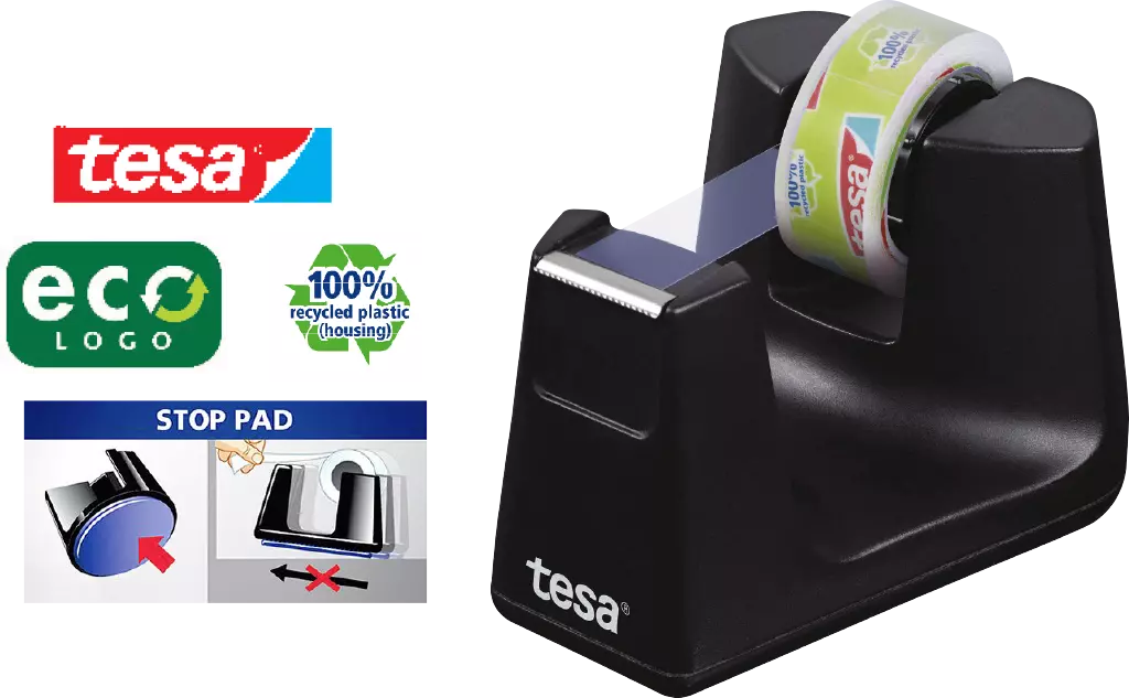 Petit dévidoir de table pour tous les bureaux, avec une technologie innovante et un boîtier en plastique 100 % recyclé. Un support antidérapant sans PVC est intégré dans le boîtier afin de poser le dévidoir où on veut sans glisser ni laisser de traces. Il suffit de le nettoyer à l'eau pour restaurer toute sa capacité adhérente. Pour des rouleaux de ruban adhésif allant jusqu'au 19 mm x 33 m. Livré avec 1 rouleau Tesa « Eco & Clear » de 15 mm x 10 m. L9,3 x P7,7 x H6,3 cm. Poids 140 g.