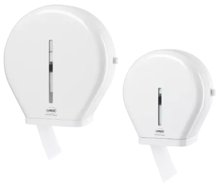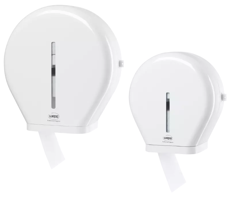 Distributeurs professionnels Wepa pour grands rouleaux de papier hygiénique. Disponibles en deux formats, ils sont universels et conviennent à tous les grand rouleaux de papier hygiénique. C'est la solution pour les cabinets de toilette très fréquentés : plus besoin de surveiller sans cesse s'il faut changer le rouleau ! En matière plastique sans chlore résistant aux chocs (ABS), leur fenêtre de visualisation permet de suivre l'avancement de la consommation du rouleau. Ils sont simples d'utilisation grâce à un système de remplissage rapide et pratique. Enfin, leur frein de rouleau intégré les rend économique. À fixer au mur (nécessaire de fixation inclus). Fabriqué en Europe.