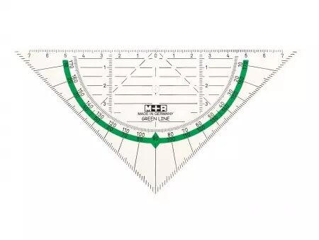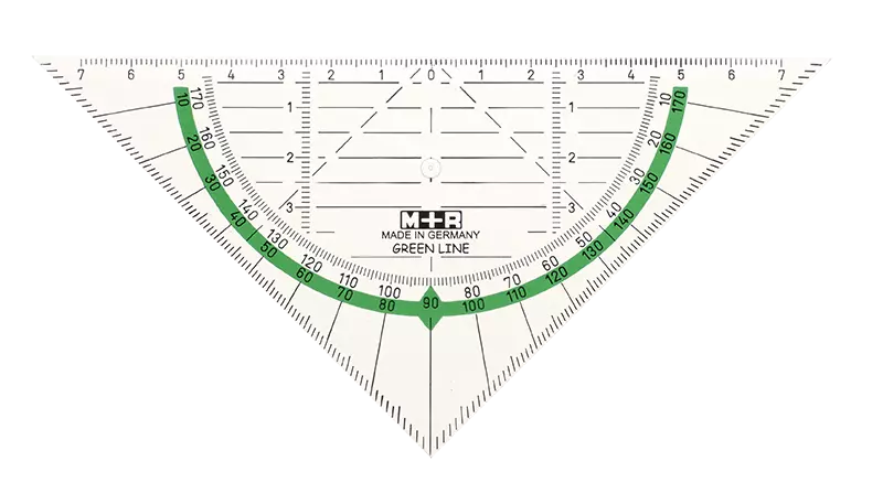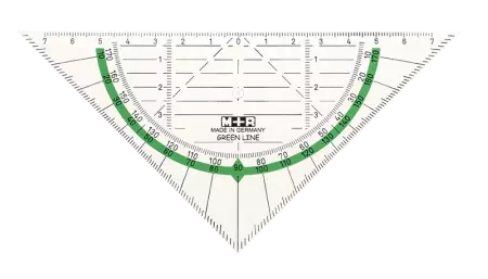 Équerre rapporteur fabriquée à partir de bioplastique PLA (acide polylactique). Hypoténuse 16 cm avec arc vert.
