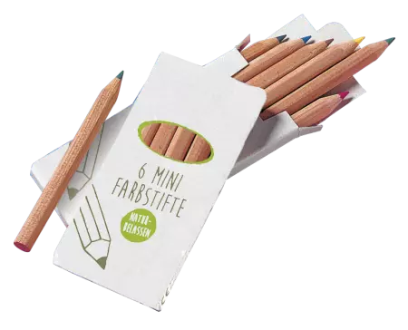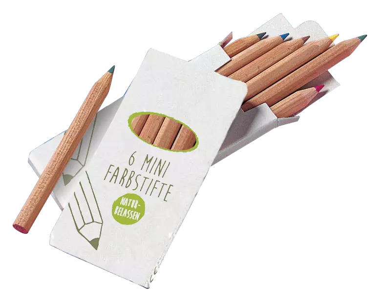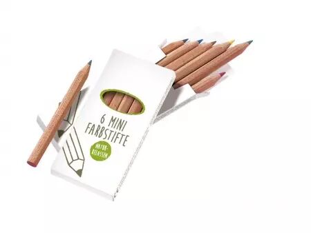 Étui de 6 petits crayons de couleur assortis, longueur 9,5 cm. Bois de hêtre naturel Européen. Étui en carton recyclé. Fabriqué en Europe.