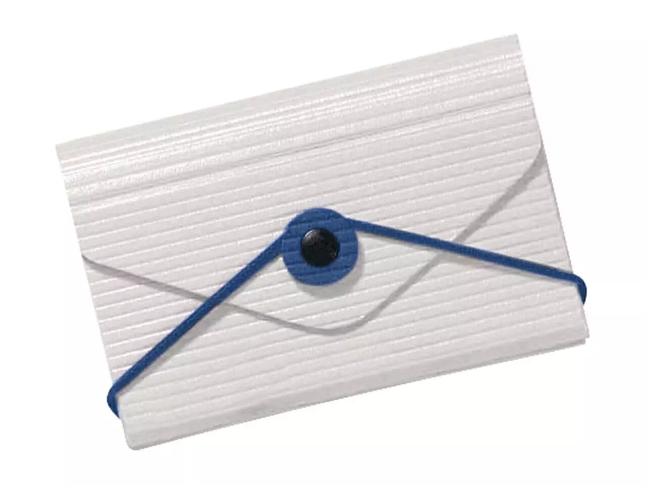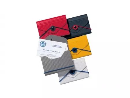 Constitué d'un étui en carton 100% recyclé décoré par de fines vagues, avec bouton et fermeture élastique. Vous pouvez insérer 30 à 35 cartes de visites. Dimensions de l'étui 9,5 x 6,5 cm, pour cartes de visite 8,5 x 5,5 cm. Disponible en cinq couleurs : noir, bleu, rouge, blanc, gris (le jaune n'est plus disponible).
