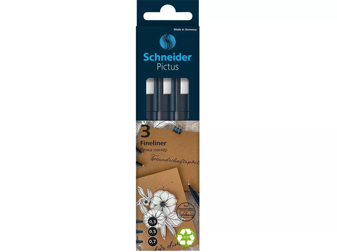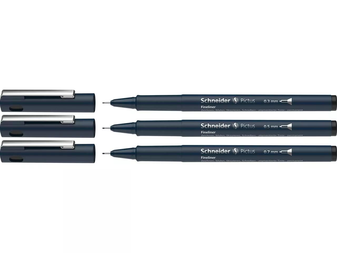 Étui de 3 feutres noirs offrant 3 largeurs d'écriture : 0,3, 0,5 et 0,7mm. Le tracé est précis, les pointes sont baguées de métal et l'encre à base d'eau.