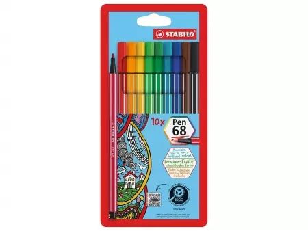 Assortiment de 10 stylos-feutre aux couleurs vives, brillantes et lumineuses, dans un étui en carton. Avec leur solide pointe qui diffuse uniformément les couleurs, ces feutres vous accompagneront à l'école, au travail et dans vos projets créatifs, qu'il s'agisse de croquis, correspondance ou coloriage. Les encres hydrosolubles bénéficient d'une protection contre le désèchement de 24 heures sans capuchon. Le corps du stylo-feutre est à 96 % fabriqué en plastique biosourcé. Largeur de trait de 1 mm.